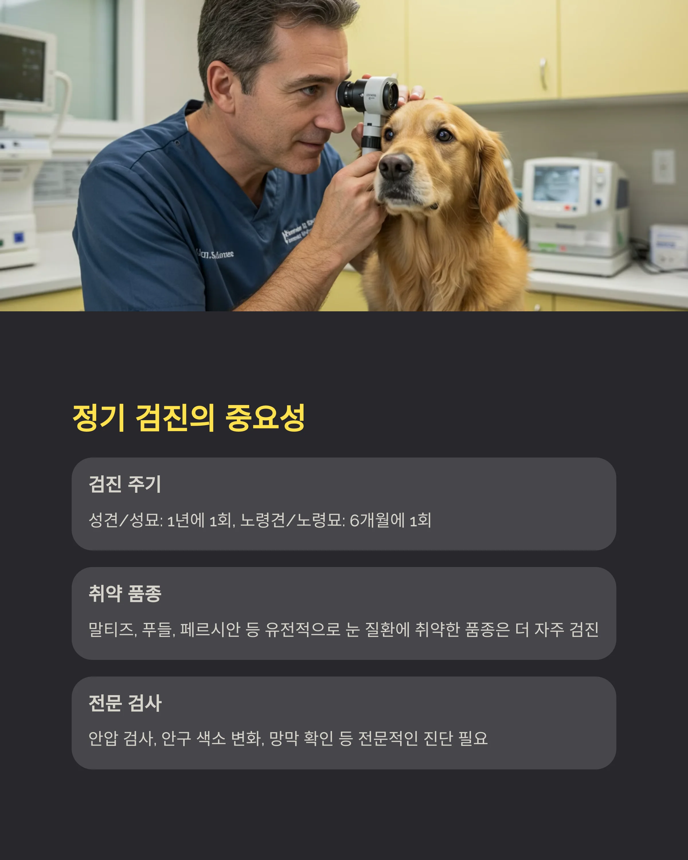 검진 시 수의사는 안압 검사, 안구 색소 변화, 망막 확인 등 전문적인 진단을 통해 눈 속 깊은 문제까지 체크해줘요. 집에서는 절대 알 수 없는 이상이 조기에 발견될 수도 있어요.