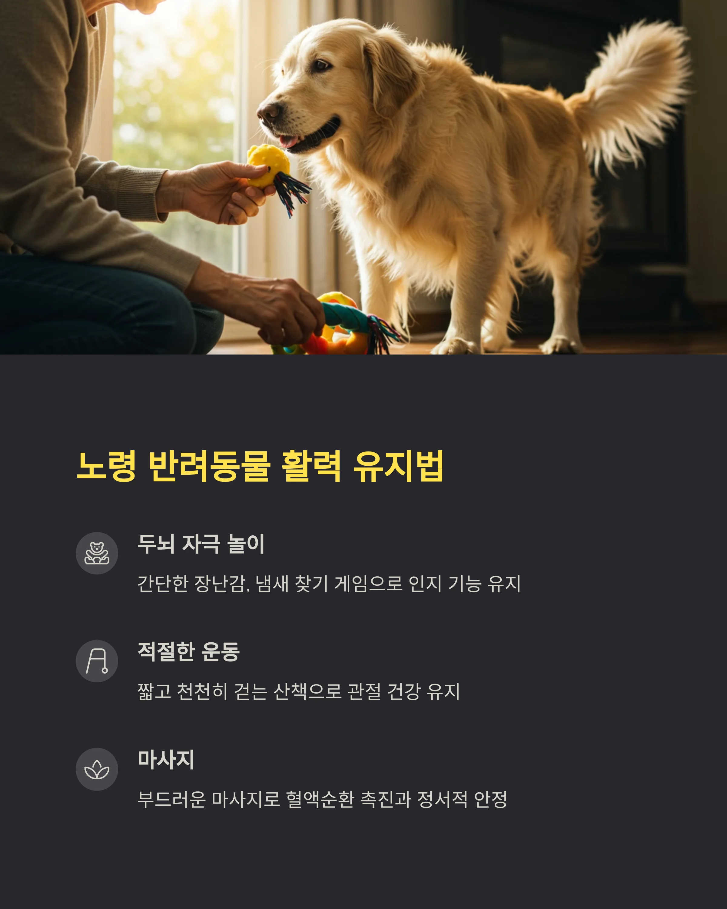 다음은 이 건강 관리를 뒷받침해줄 수 있는 **노령동물 맞춤 식단 구성법**을 소개할게요. 무엇을 먹이느냐에 따라 삶의 질이 달라지거든요! 🍽️