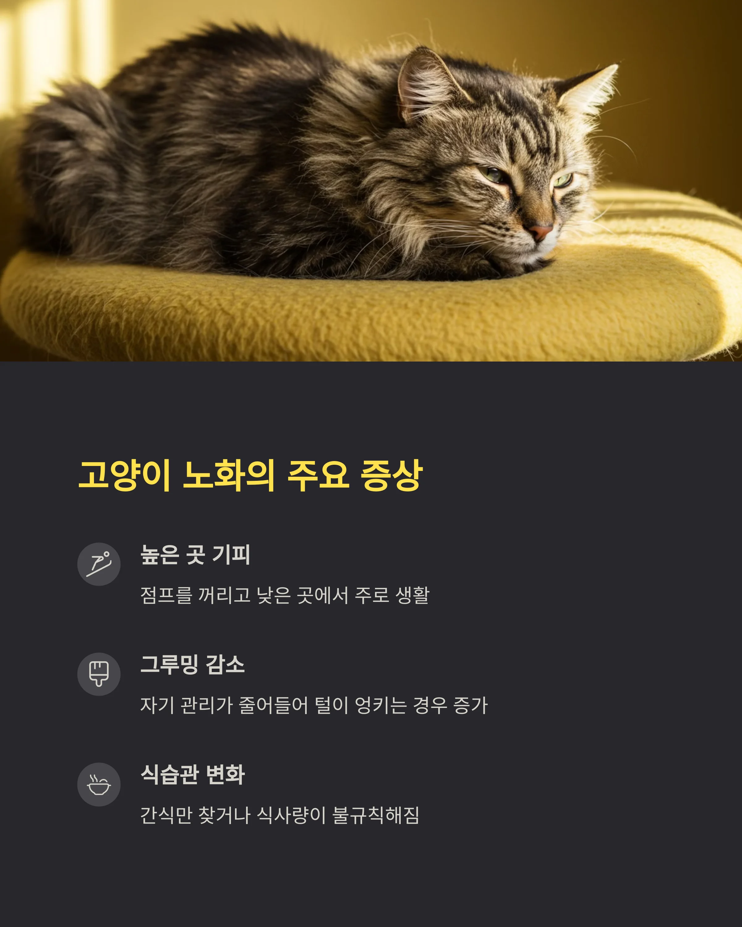 | 털과 피부 변화 | 피부 건조, 털 푸석함 | 그루밍 줄어들어 털 엉킴 |