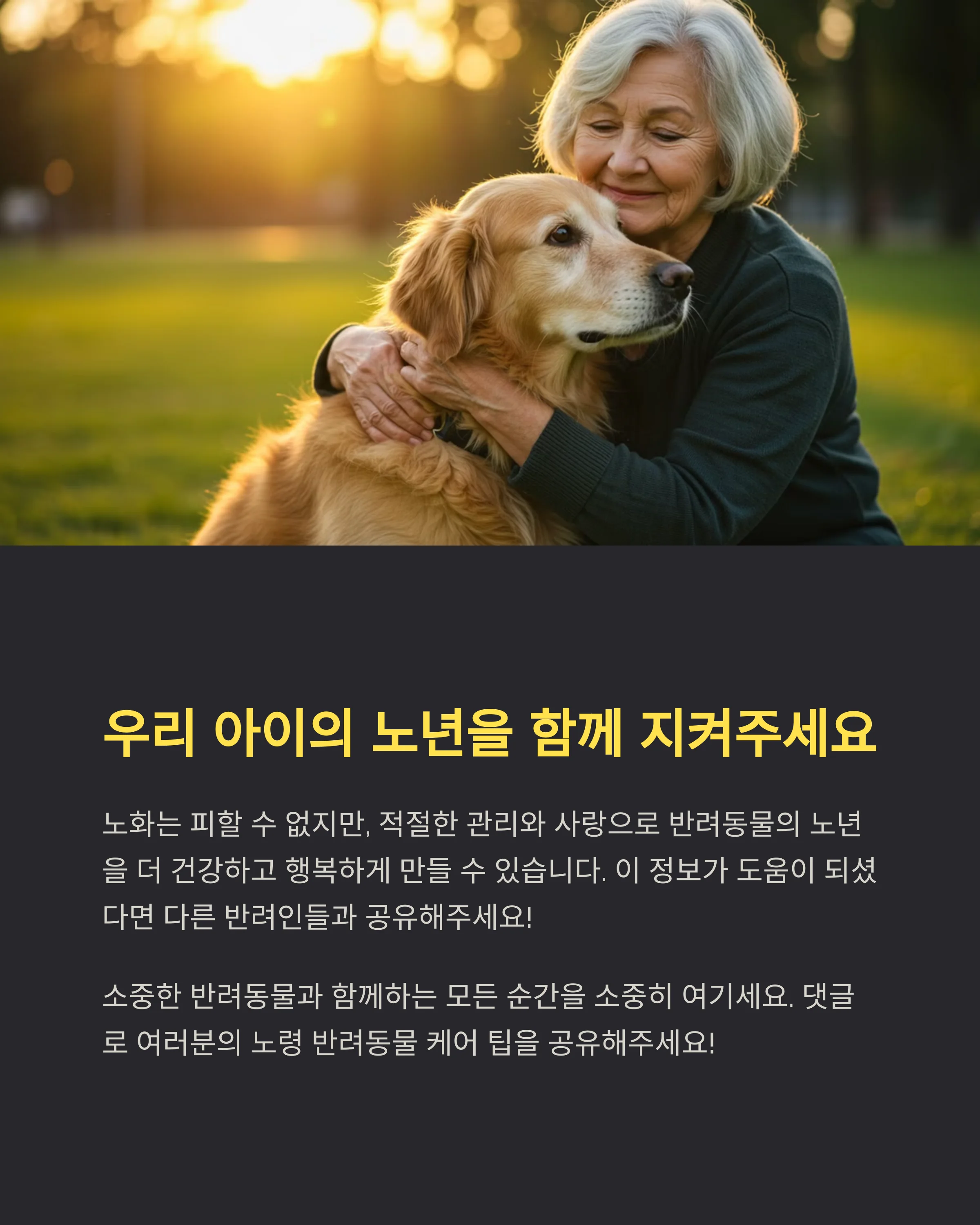 노화는 멈출 수 없지만, **관리와 케어에 따라 노후의 질은 완전히 달라질 수 있어요.** 강아지와 고양이 모두 나이가 들수록 질병의 위험이 높아지기 때문에 예방 중심의 건강 관리가 정말 중요하답니다. 😊