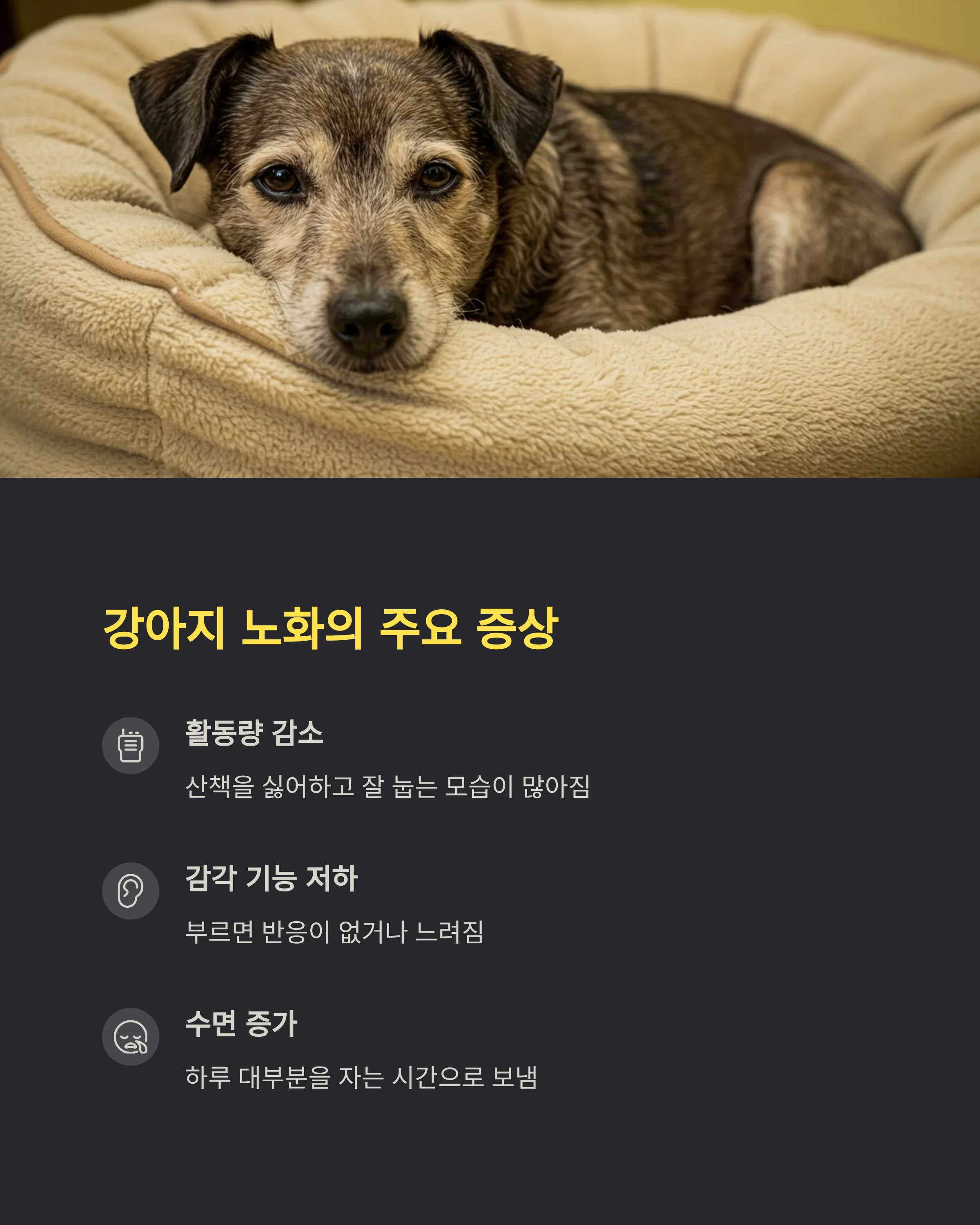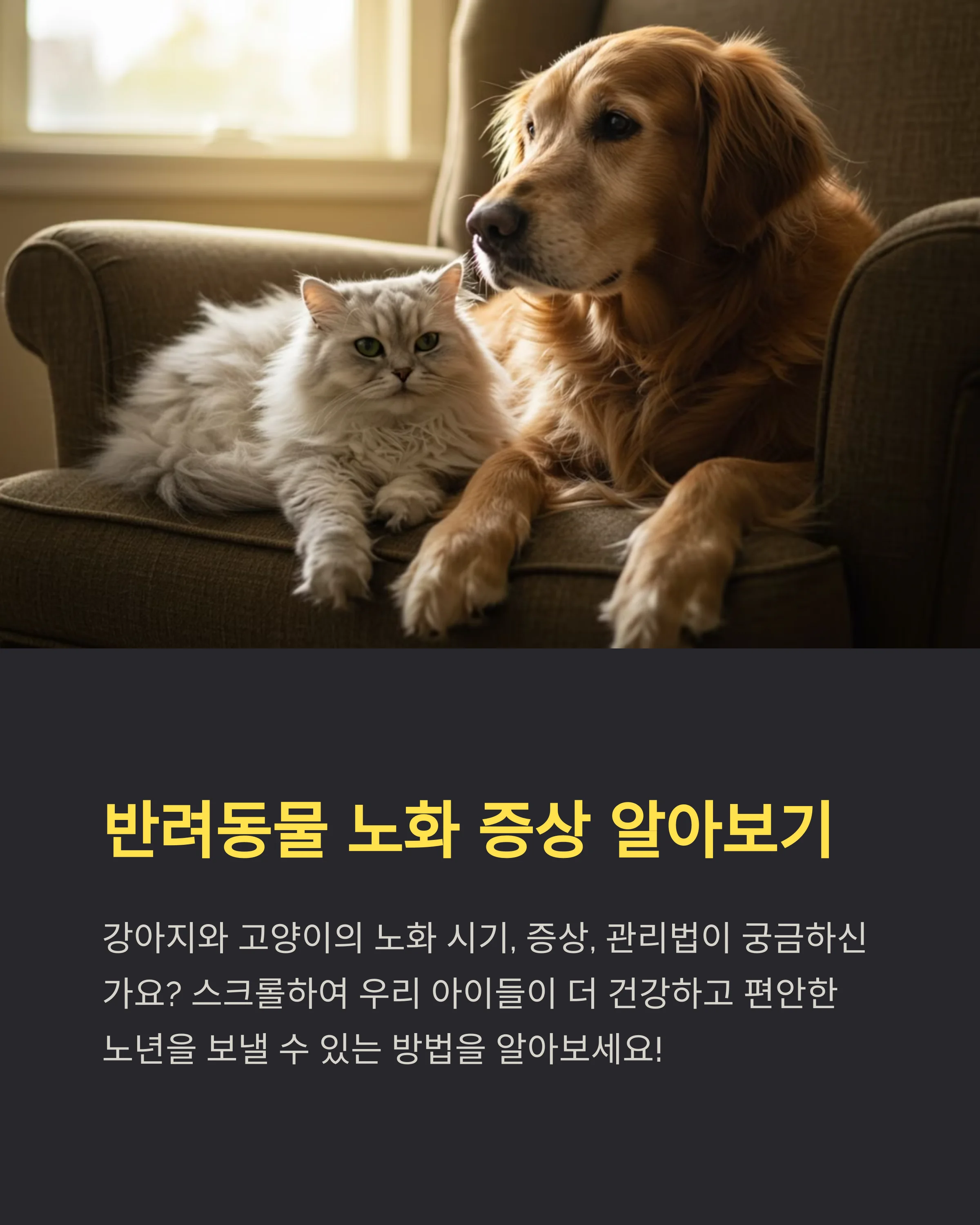 반려동물도 나이를 먹어요. 어느 순간 예전보다 움직임이 느려지고, 자주 자고, 계단을 힘들어하거나, 식습관이 변하는 걸 보면 '이제 우리 아이도 나이가 들었구나' 싶죠. 강아지와 고양이 모두 시간이 지나면 **노화 증상**이 나타나요. 🧓🐾
