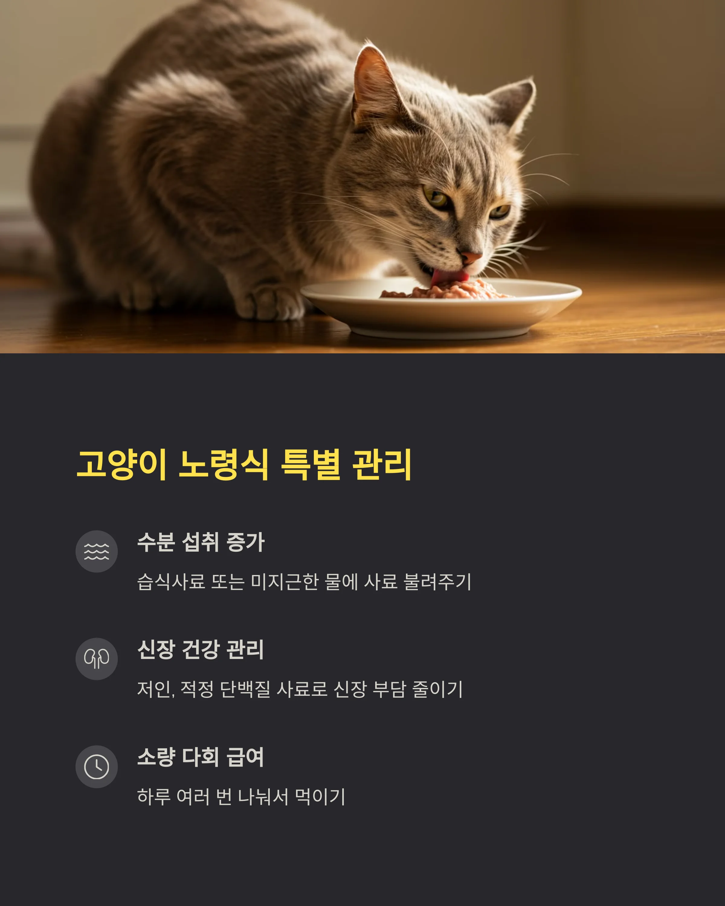 | 수분 | 신장 보호, 배뇨 촉진 | 습식사료, 육수 혼합 |