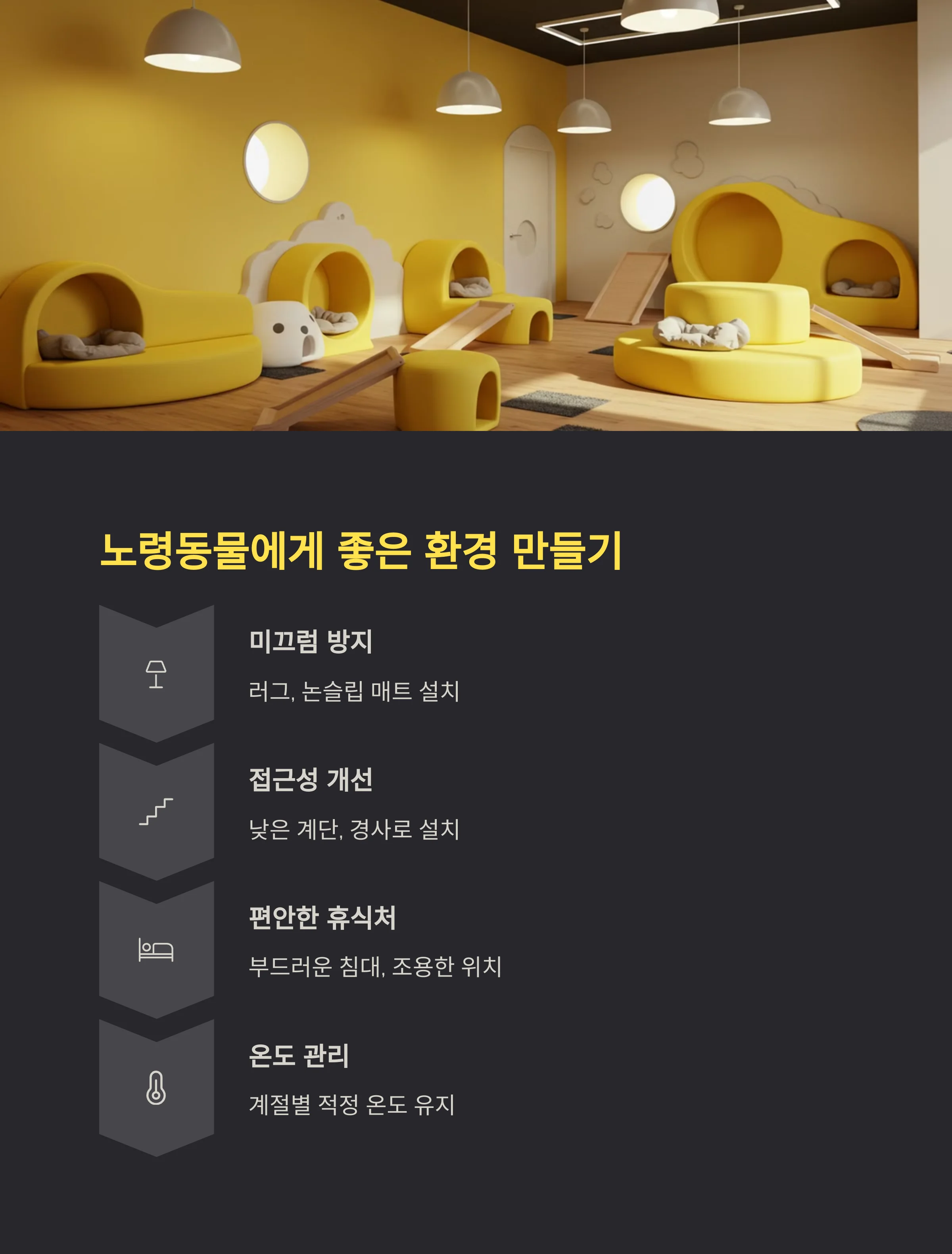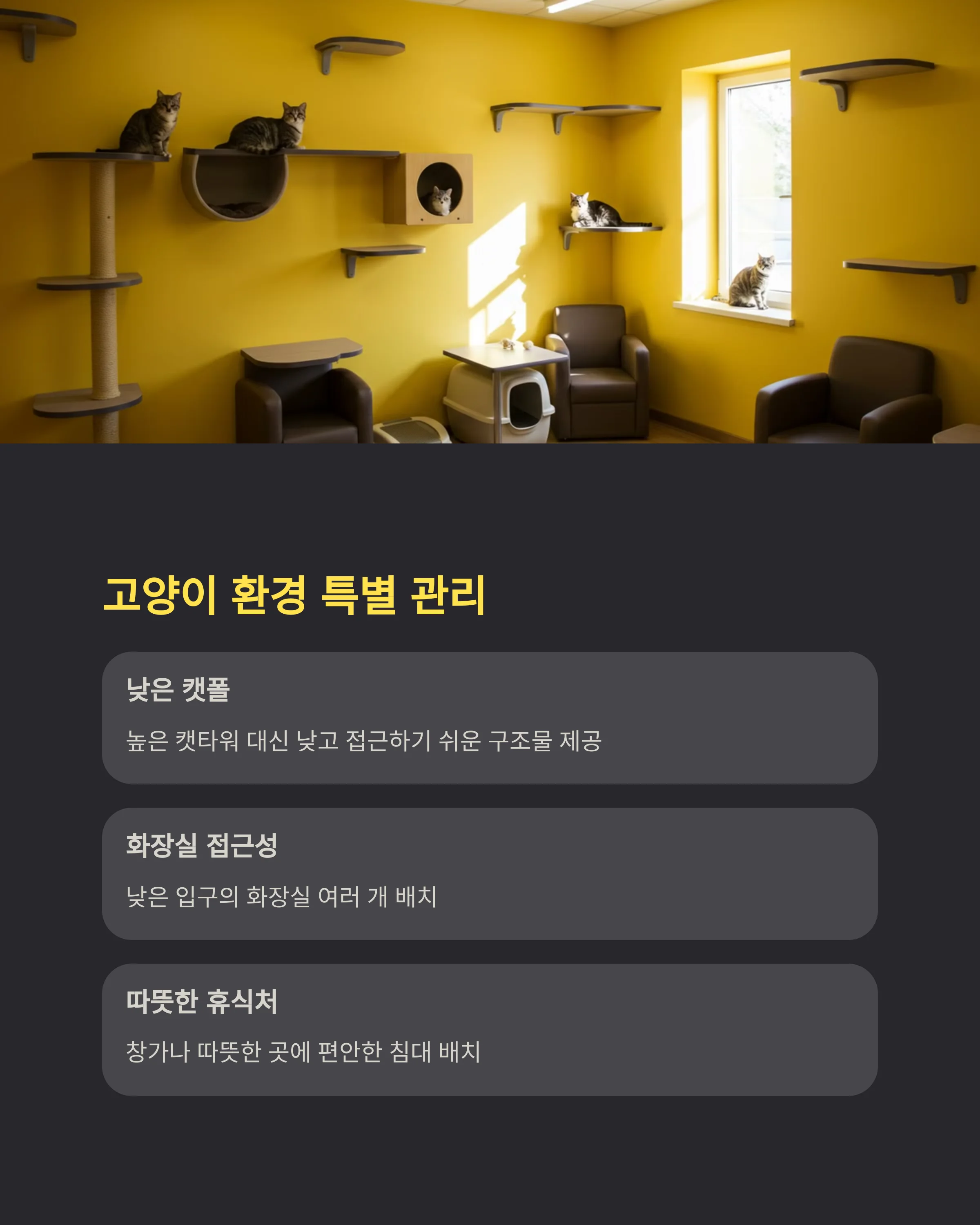 또한 계단이나 높은 곳을 오르내리기 어려워지기 때문에 **쿠션식 계단이나 경사로**를 설치해주는 게 좋아요. 고양이의 경우 캣타워보다는 **낮은 캣폴이나 바닥형 캣하우스**로 바꾸는 걸 추천해요. 🐾