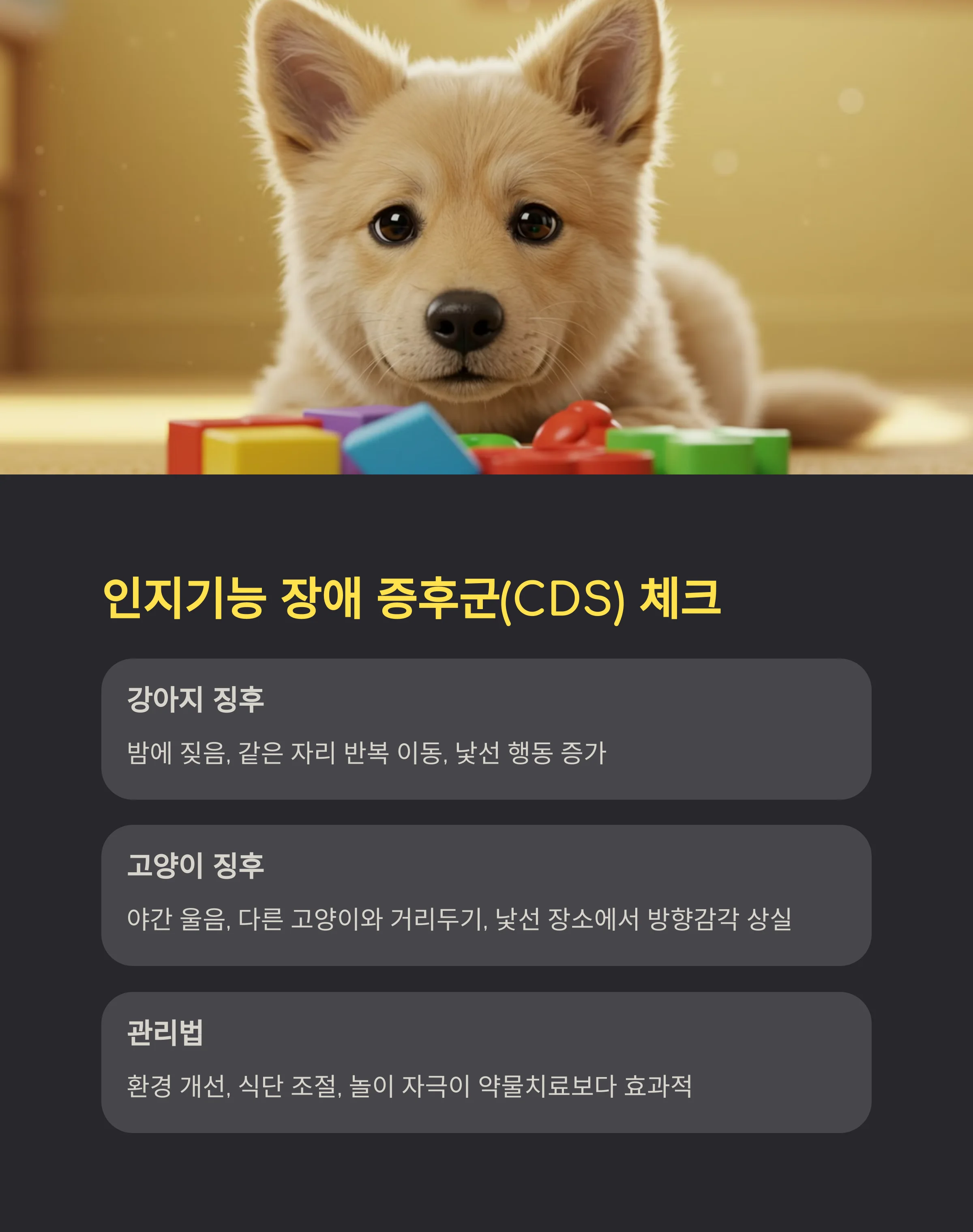 이러한 행동 변화가 관찰된다면 **인지기능 장애 증후군(CDS)**를 의심해볼 수 있어요. 약물치료보다는 **환경 개선, 식단 조절, 놀이 자극**이 훨씬 효과적일 수 있으니, 자연스럽게 생활 루틴을 바꿔주는 게 좋아요. 😊
