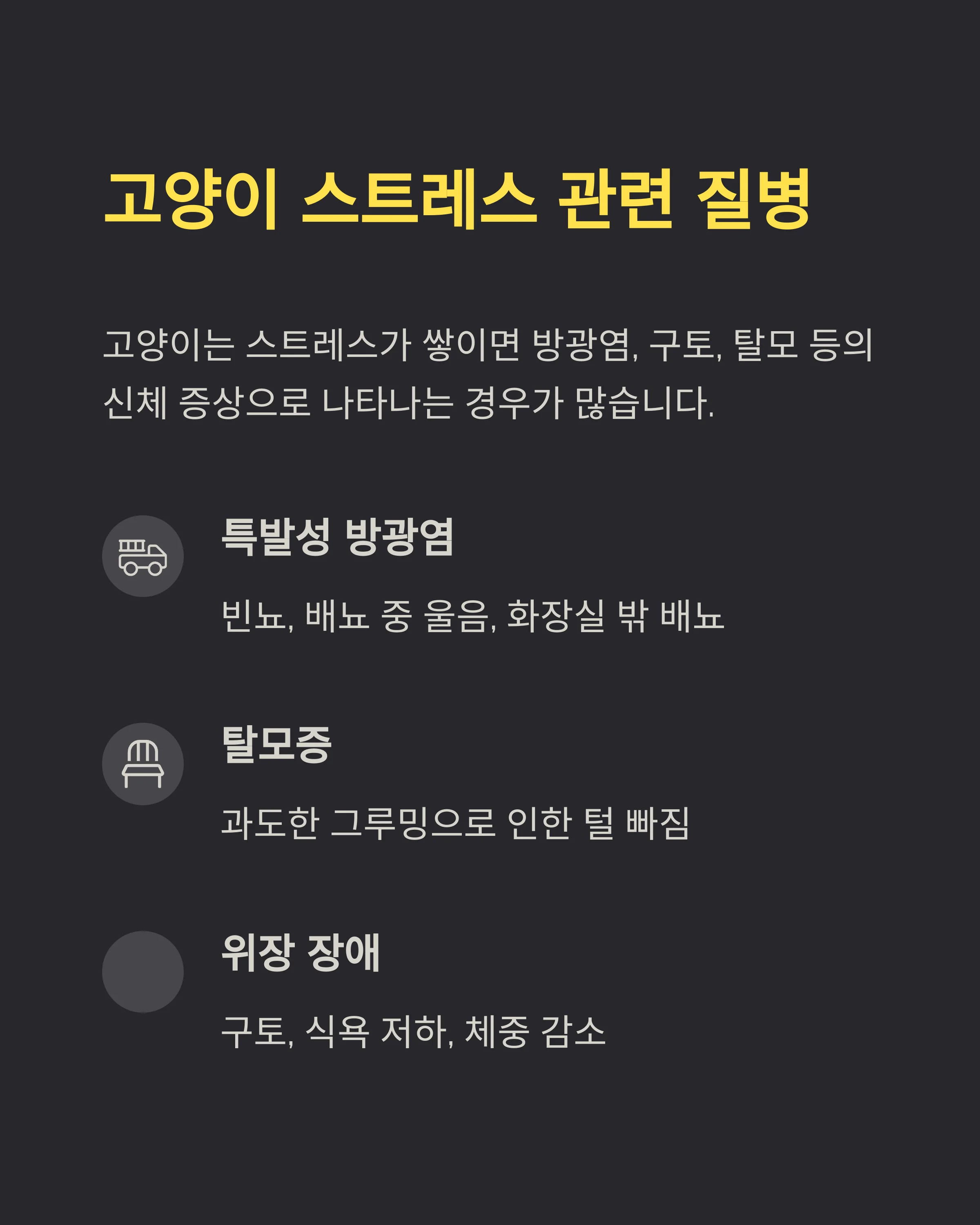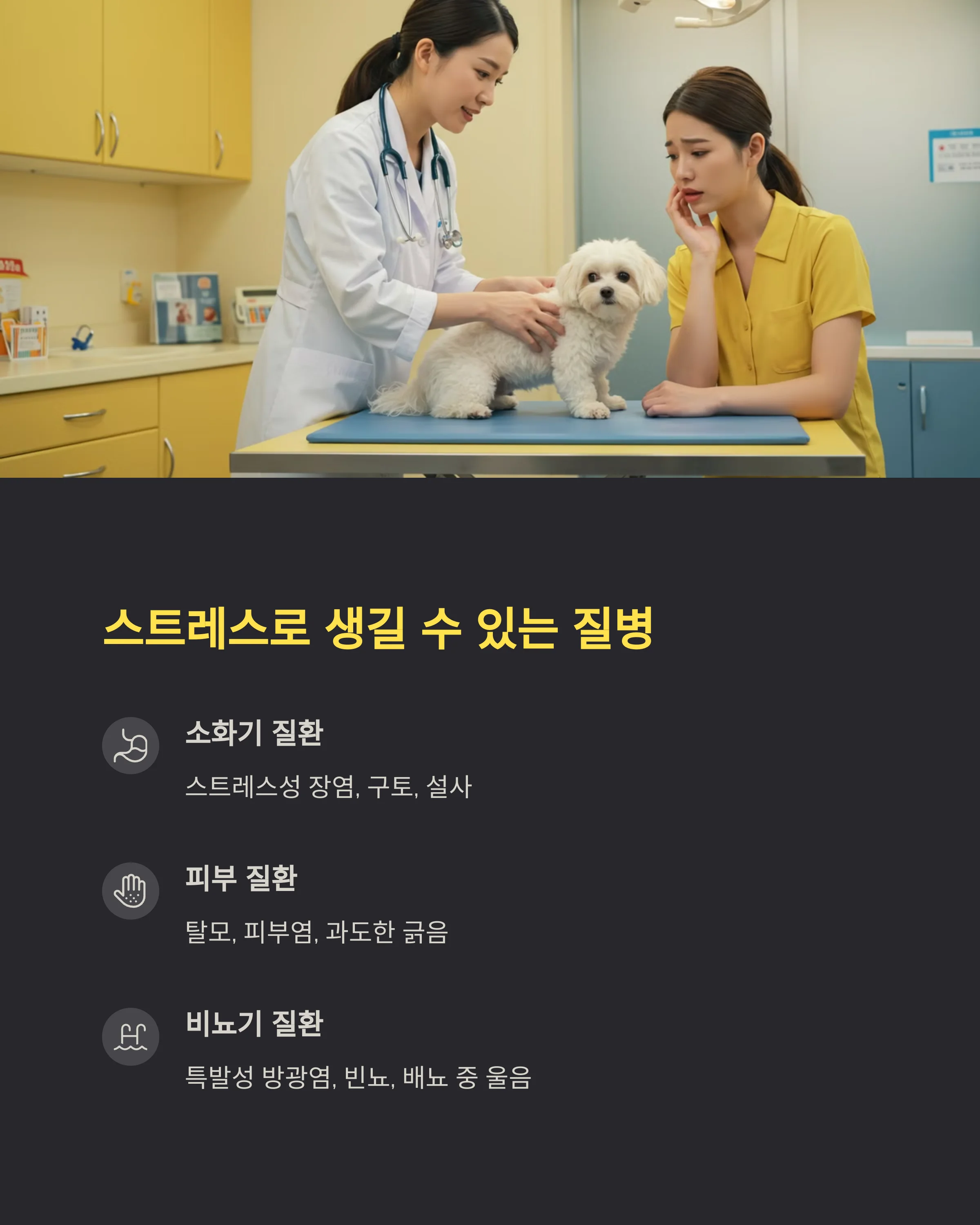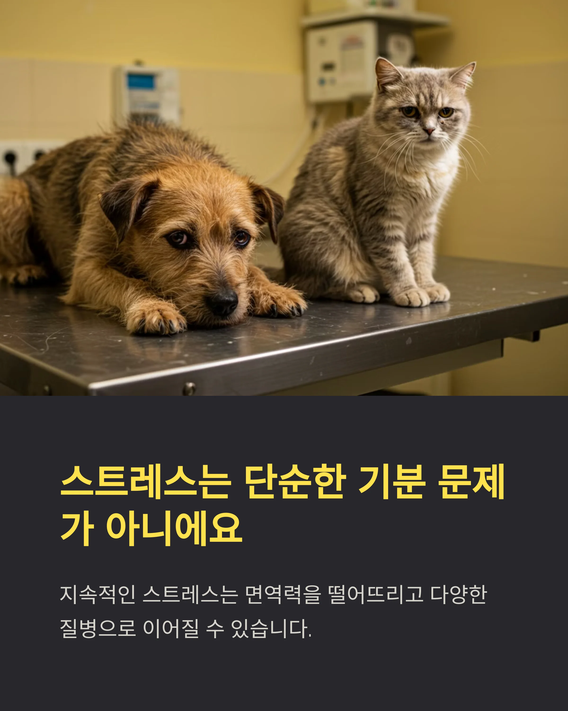 대표적으로 **강아지는 소화기 질환, 분리불안, 피부병** 등으로 이어지고, 고양이는 **특발성 방광염, 탈모, 위장 장애, 식욕부진**으로 나타나요. 모든 질병이 스트레스만으로 생기는 건 아니지만, 스트레스가 질병의 트리거가 되는 경우가 많아요.