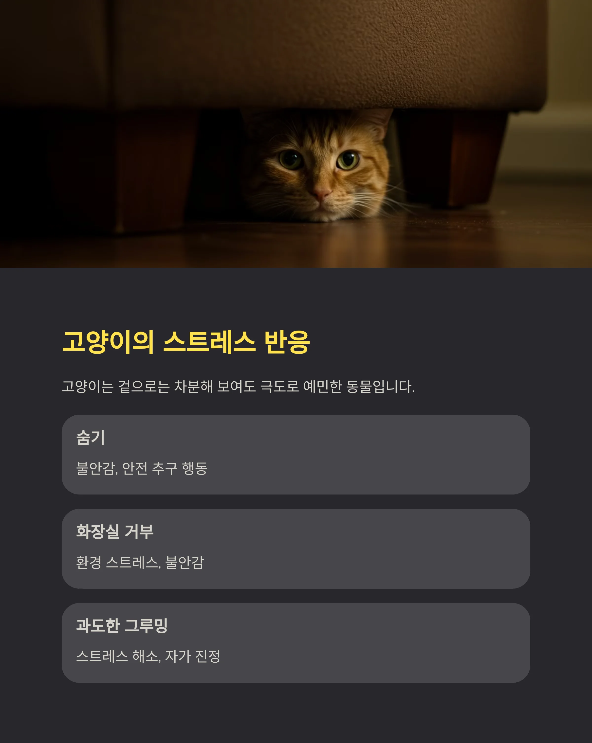다음 섹션에서는 **고양이의 스트레스 반응과 그 특징**을 알려드릴게요. 고양이는 겉으로는 차분해 보여도, 속으로는 크게 흔들릴 수 있는 동물이거든요! 😼