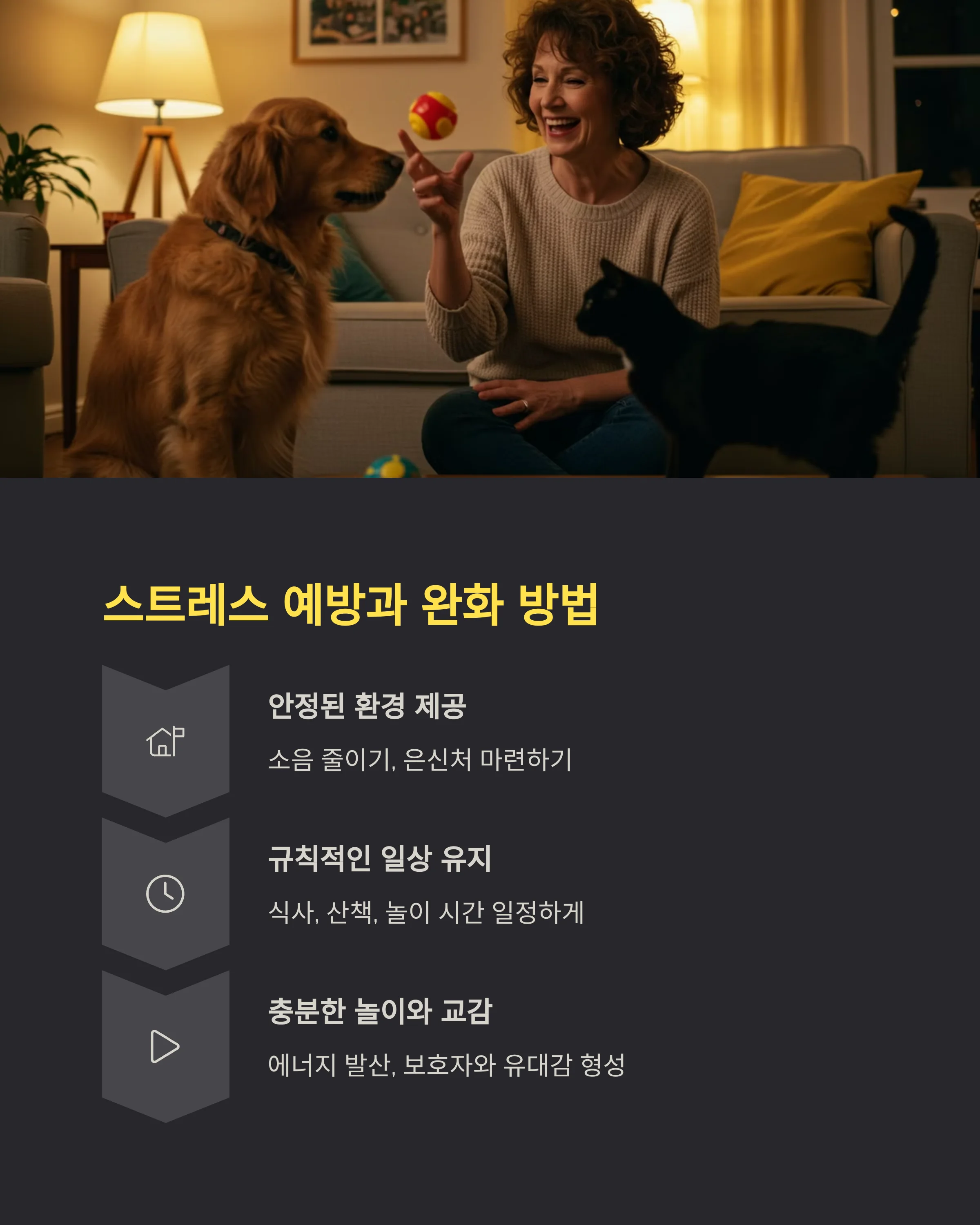 이제 다음 섹션에서는 강아지와 고양이 모두에게 해당되는 **스트레스 예방과 완화 방법**을 알려드릴게요. 아이들의 몸과 마음이 편안해질 수 있는 생활 팁들을 모았어요! 🌿