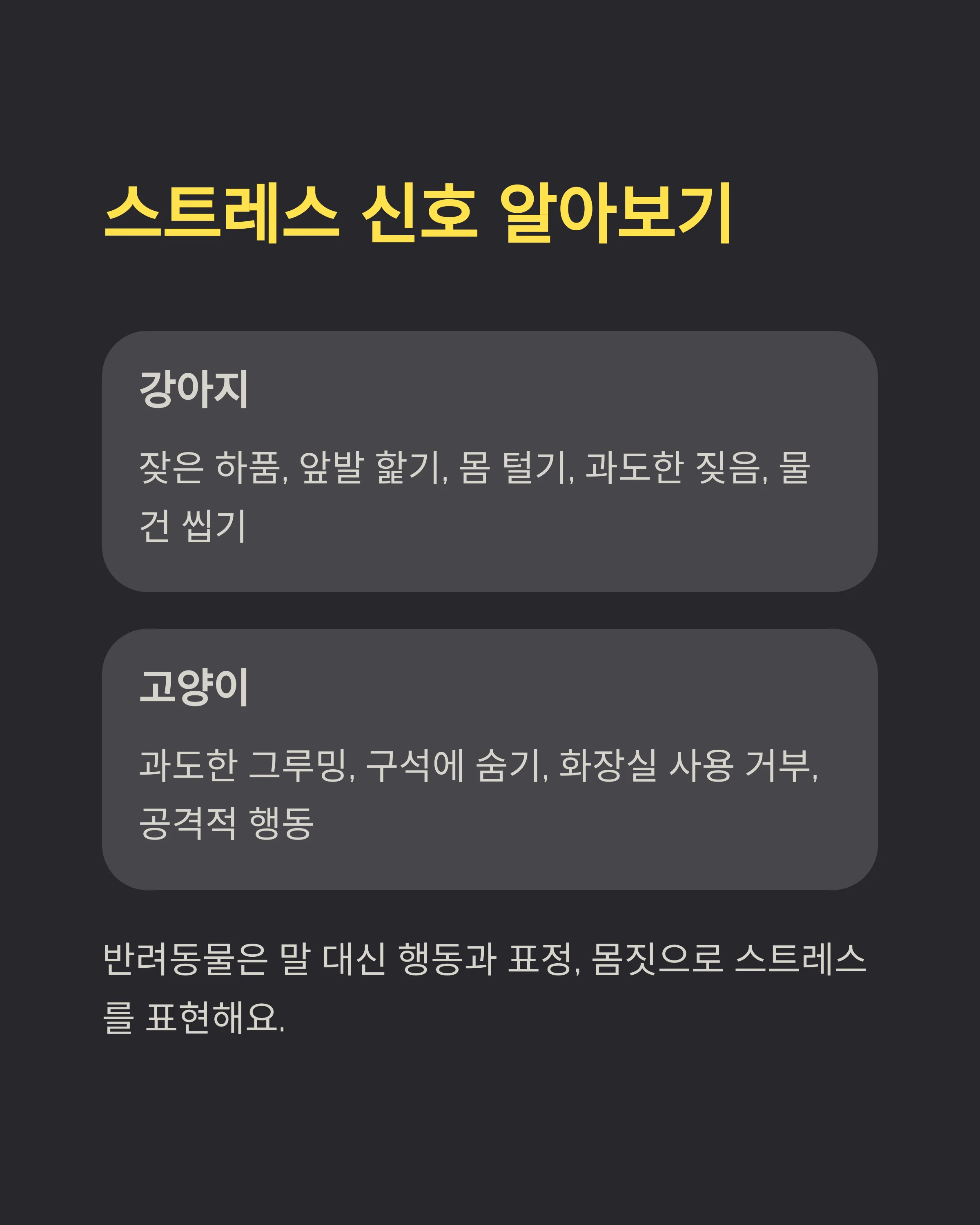 반려동물은 말 대신 **행동과 표정, 몸짓으로 스트레스를 표현해요.** 이런 신호를 놓치지 않고 알아차리는 것이 스트레스를 줄여주는 첫 번째 방법이에요. 보호자가 아이의 작은 변화에 민감해질 필요가 있답니다. 🕵️♀️
