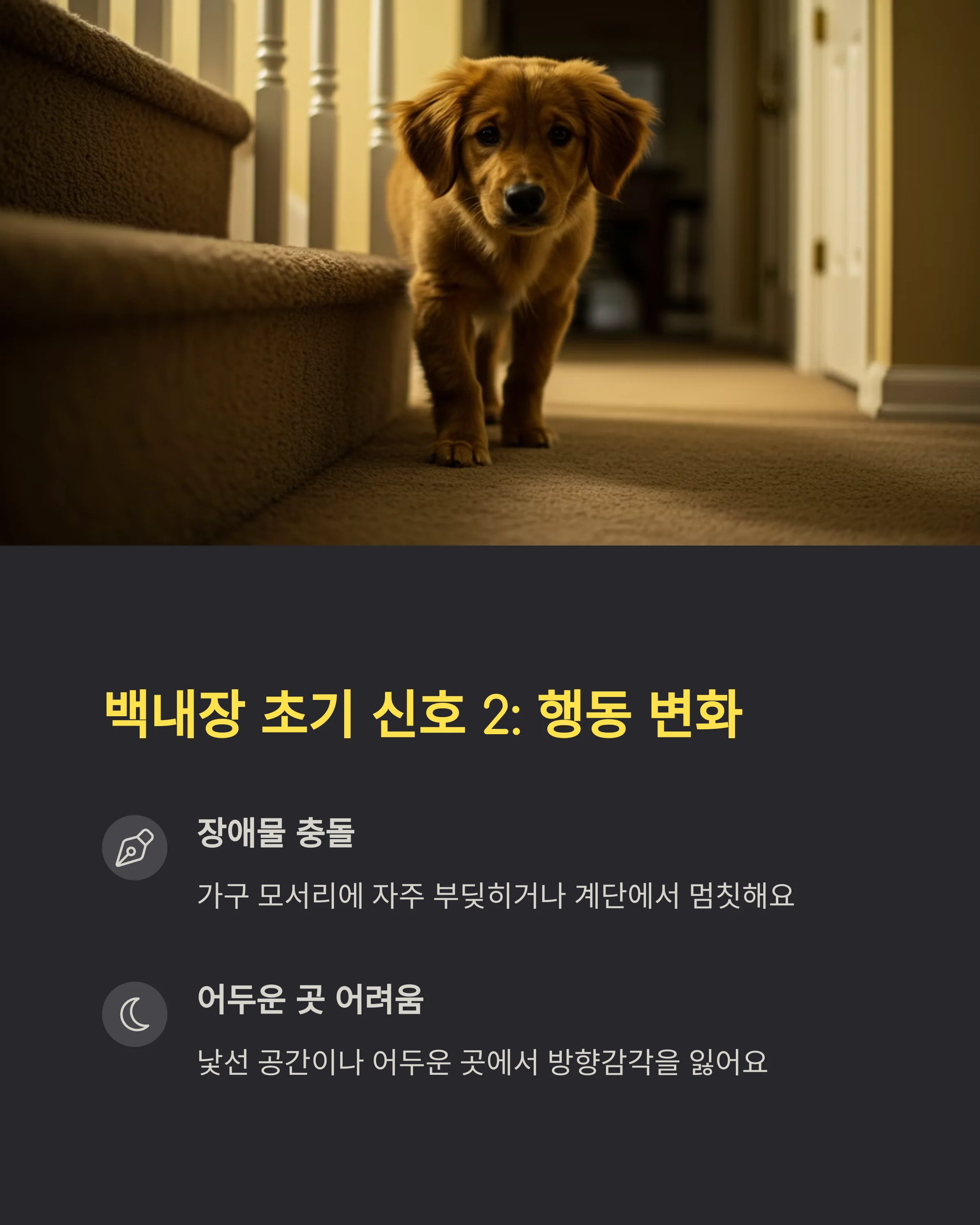 시야가 흐려지면, 강아지가 가구 모서리에 부딪히거나 계단 내려갈 때 멈칫하는 경우가 늘어요. “이전엔 잘 뛰어다녔는데, 요즘은 어두운 곳에서 잘 못 움직여요.”라는 반응도 자주 나와요. 이런 변화가 반복된다면 안과 검진을 받아보는 게 좋아요.
