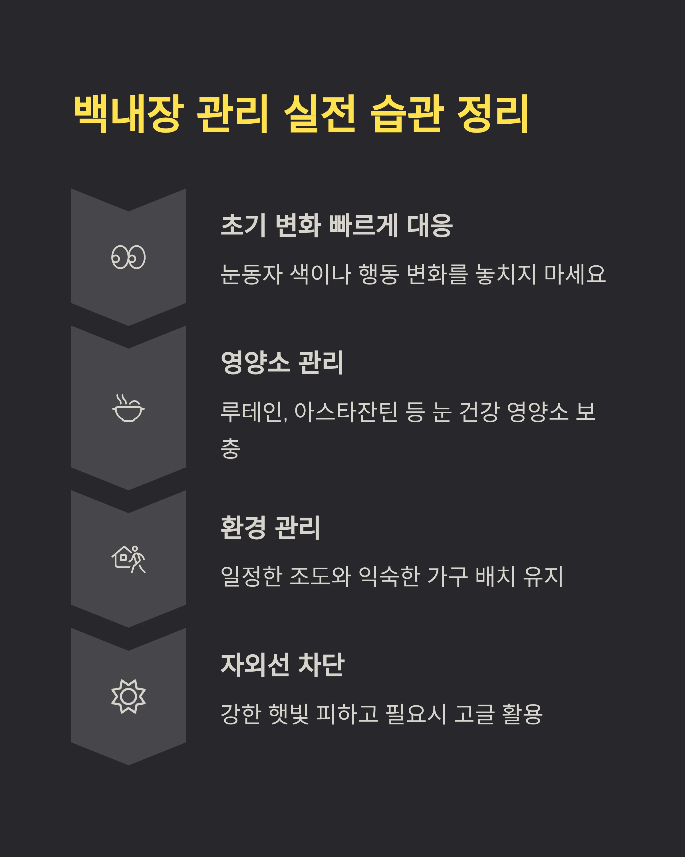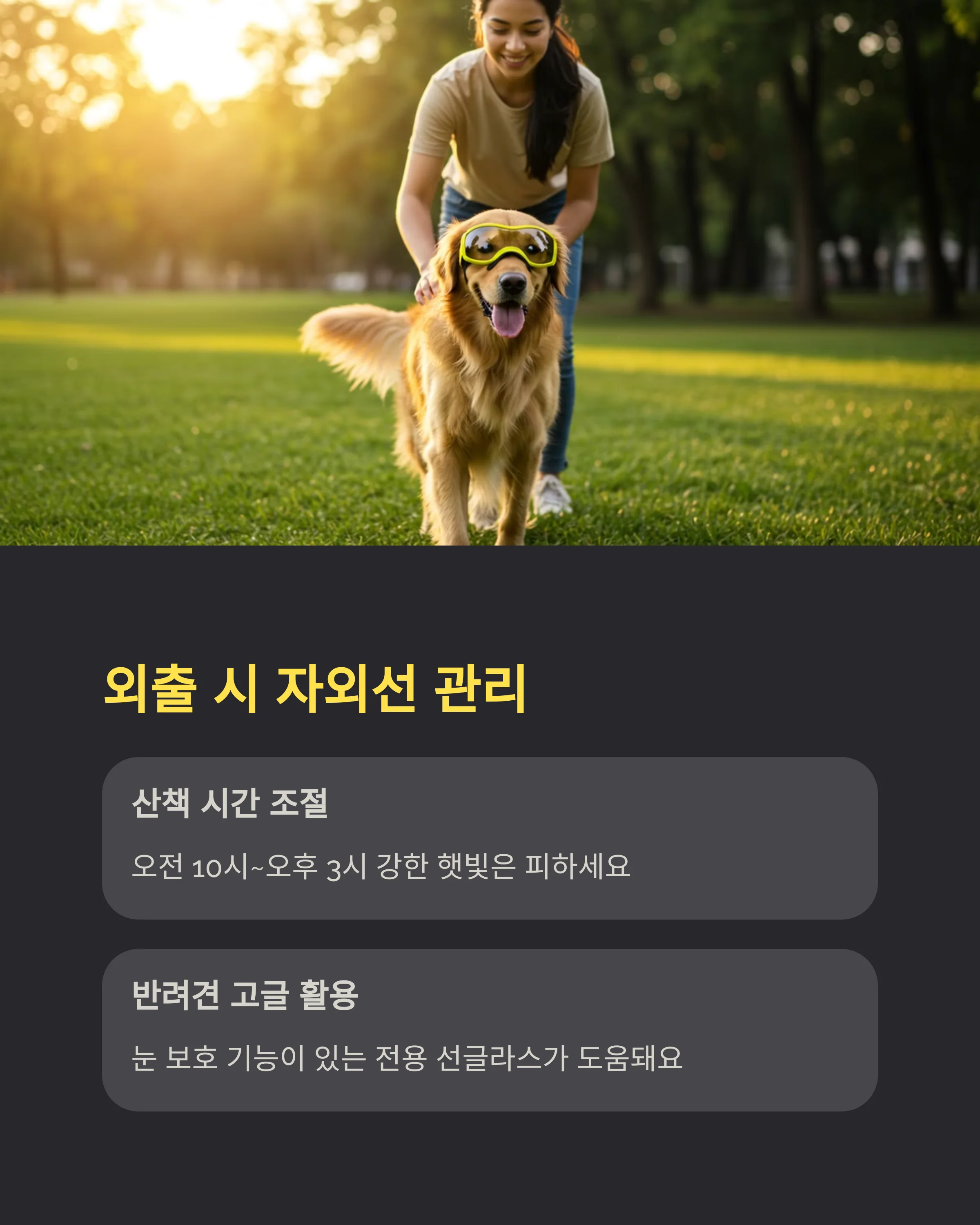백내장이 진행된 눈은 자외선에 더 민감해요. 그래서 산책할 때는 햇빛이 강한 오전 10시~오후 3시 시간대는 피하고, 모자나 반려견 전용 선글라스를 활용하는 것도 방법이에요. 요즘은 눈 보호 기능이 있는 고글도 많이 나왔어요.