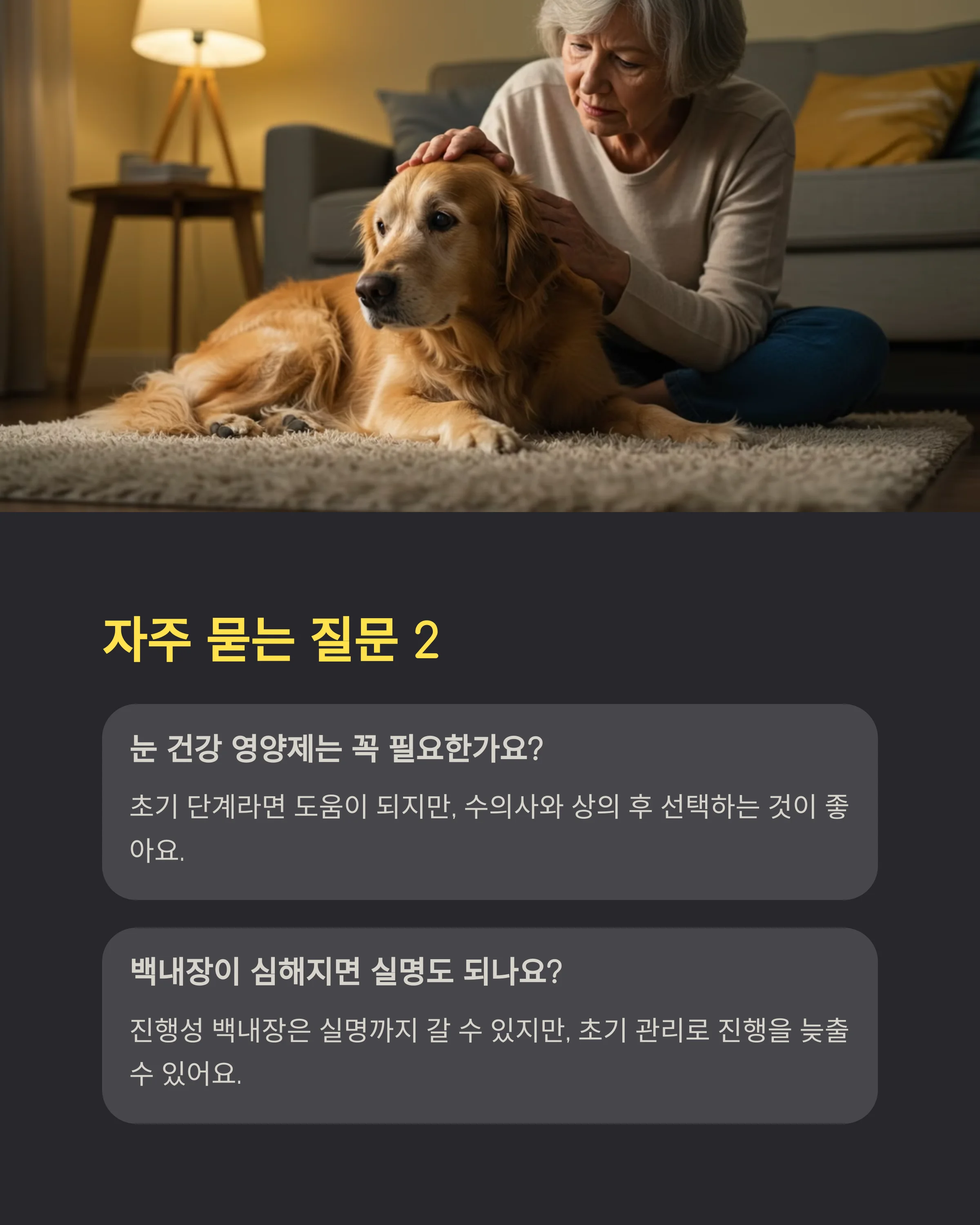 백내장이 의심되거나 초기 단계라면 영양제 도움이 돼요. 다만, 제품에 따라 효과나 흡수율 차이가 크기 때문에 수의사와 상의 후 선택하는 게 좋아요.