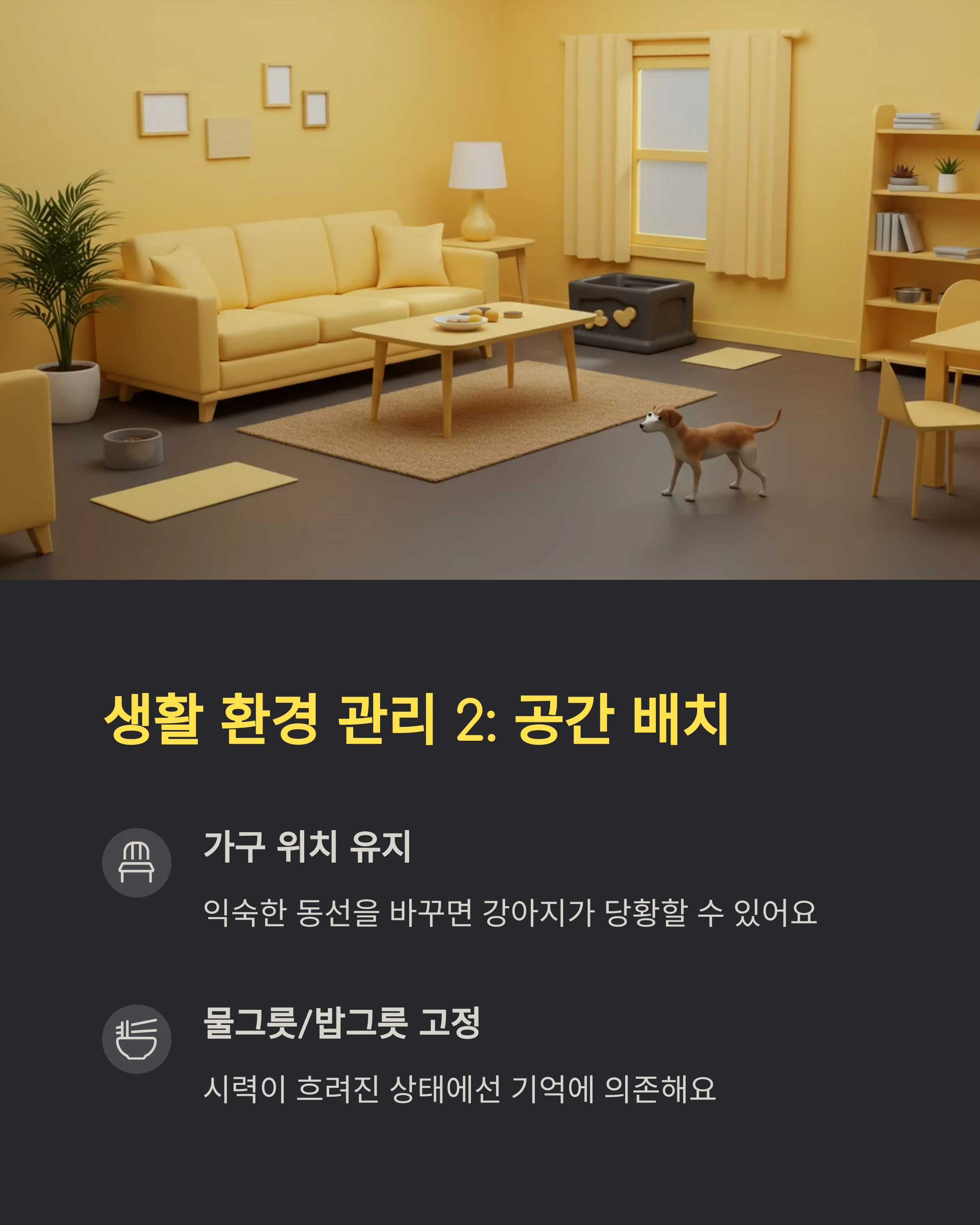 가구 위치를 바꾸거나, 문을 평소와 다르게 닫아두면 강아지가 당황할 수 있어요. 시력이 흐려진 상태에선 기억에 의존하는 경우가 많기 때문에 생활 동선은 최대한 건드리지 않는 게 좋아요. 물그릇, 밥그릇 위치도 동일하게 유지하는 게 핵심이에요.