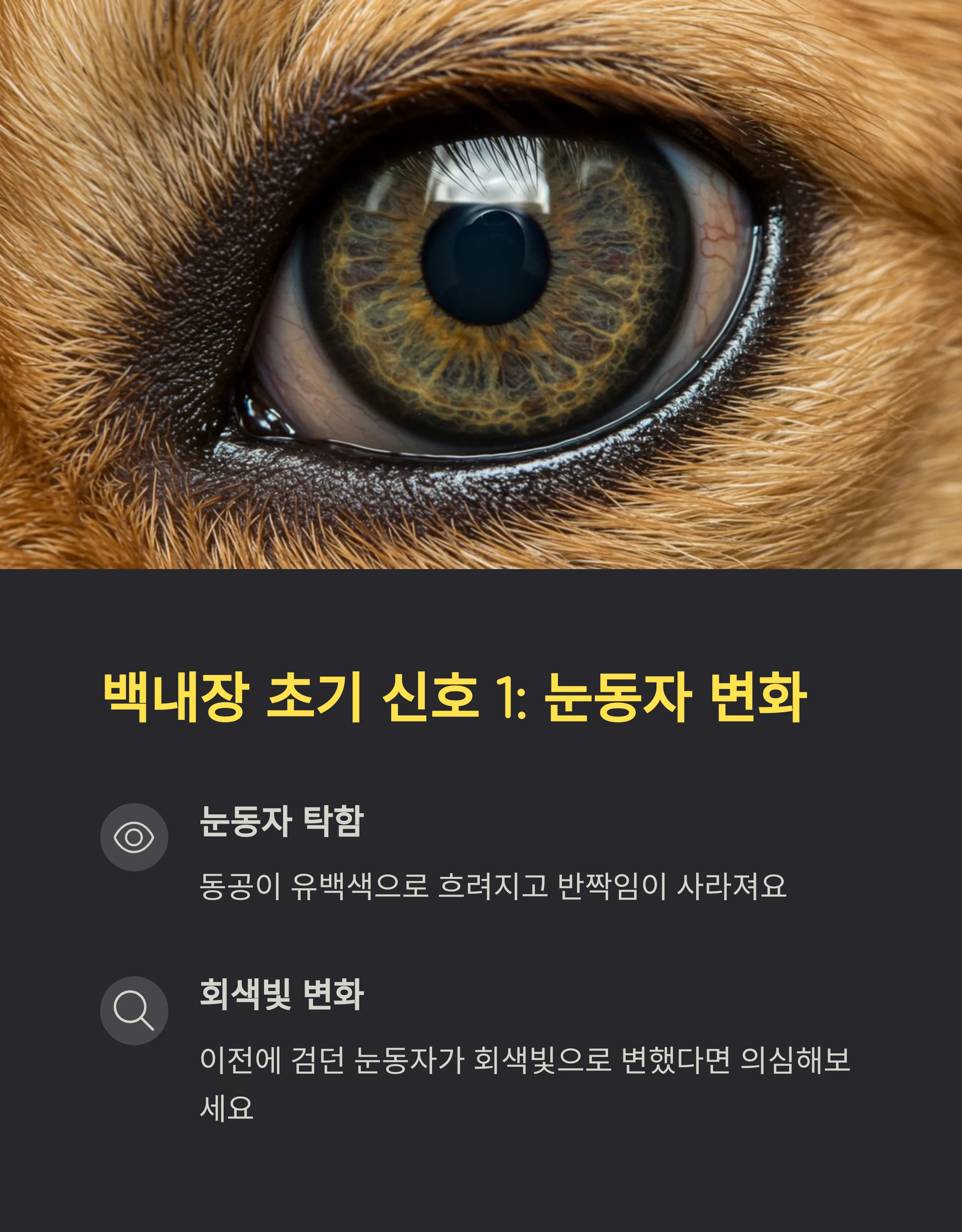백내장의 가장 대표적인 증상은 동공이 유백색처럼 탁해지는 거예요. 햇빛이나 플래시를 비췄을 때 반짝이던 검은 눈동자가 흐릿해졌다면, 초기 증상일 수 있어요. “예전엔 눈이 반짝반짝했는데 요즘은 회색빛이 도는 것 같아요.”라는 보호자도 많죠.