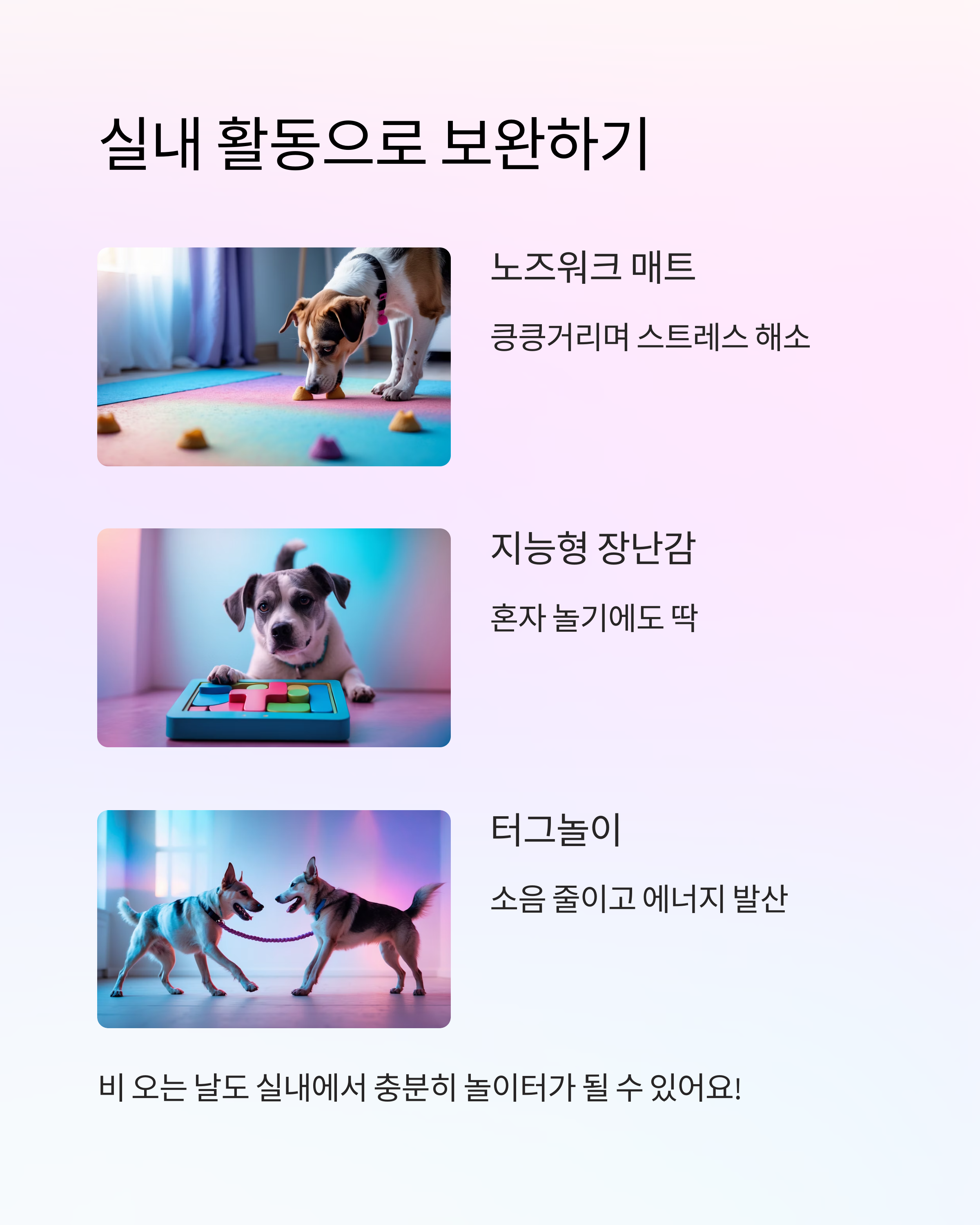 비가 오거나 바람이 많이 불어 산책이 어려운 날도 있죠. 이럴 땐 실내 놀이로 에너지를 소비시켜줄 수 있어요.