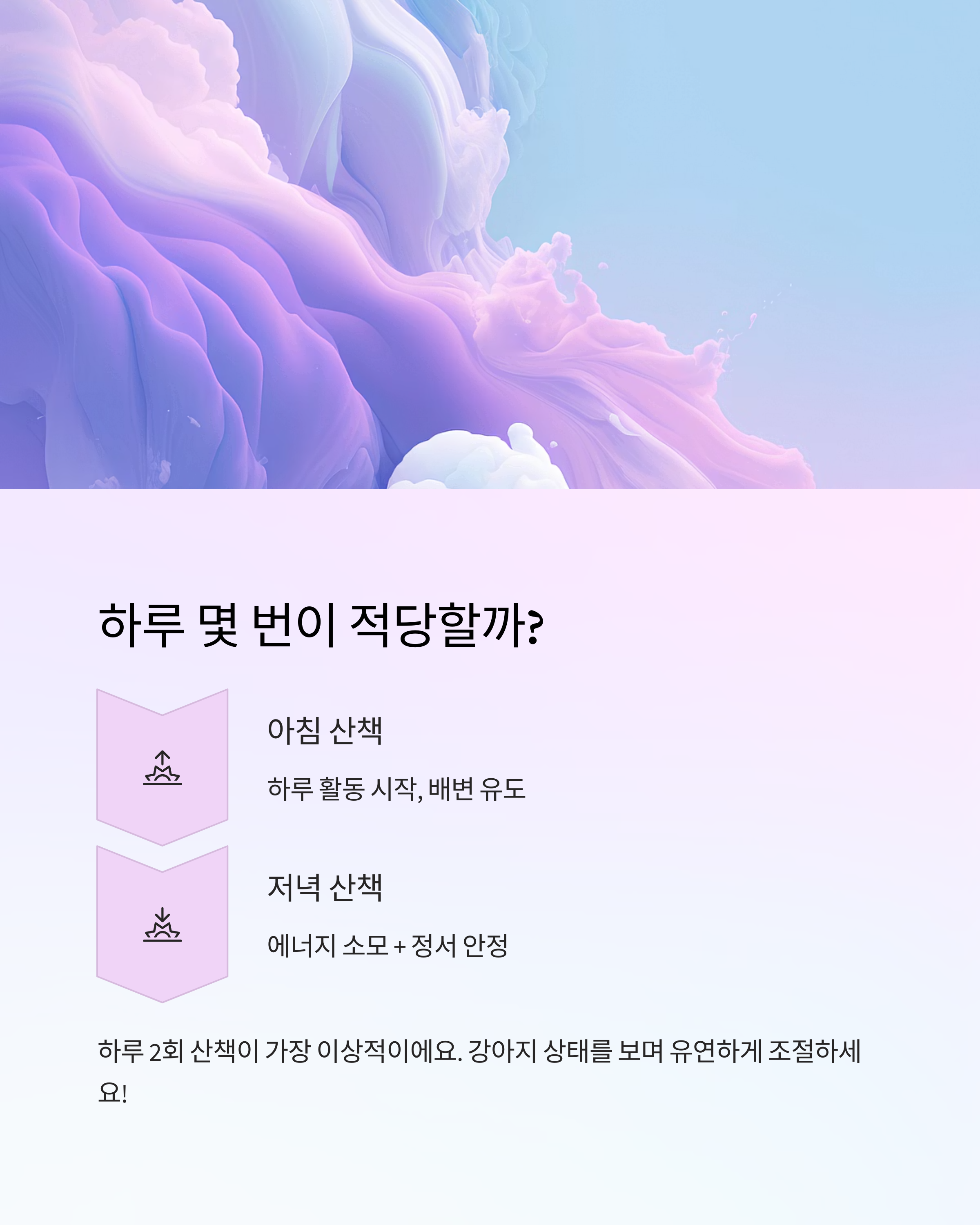 강아지의 스트레스 해소와 배변 패턴을 고려하면 하루 ‘2회 산책’이 가장 이상적이에요. 아침과 저녁을 나누어 루틴화하는 것이 좋아요.