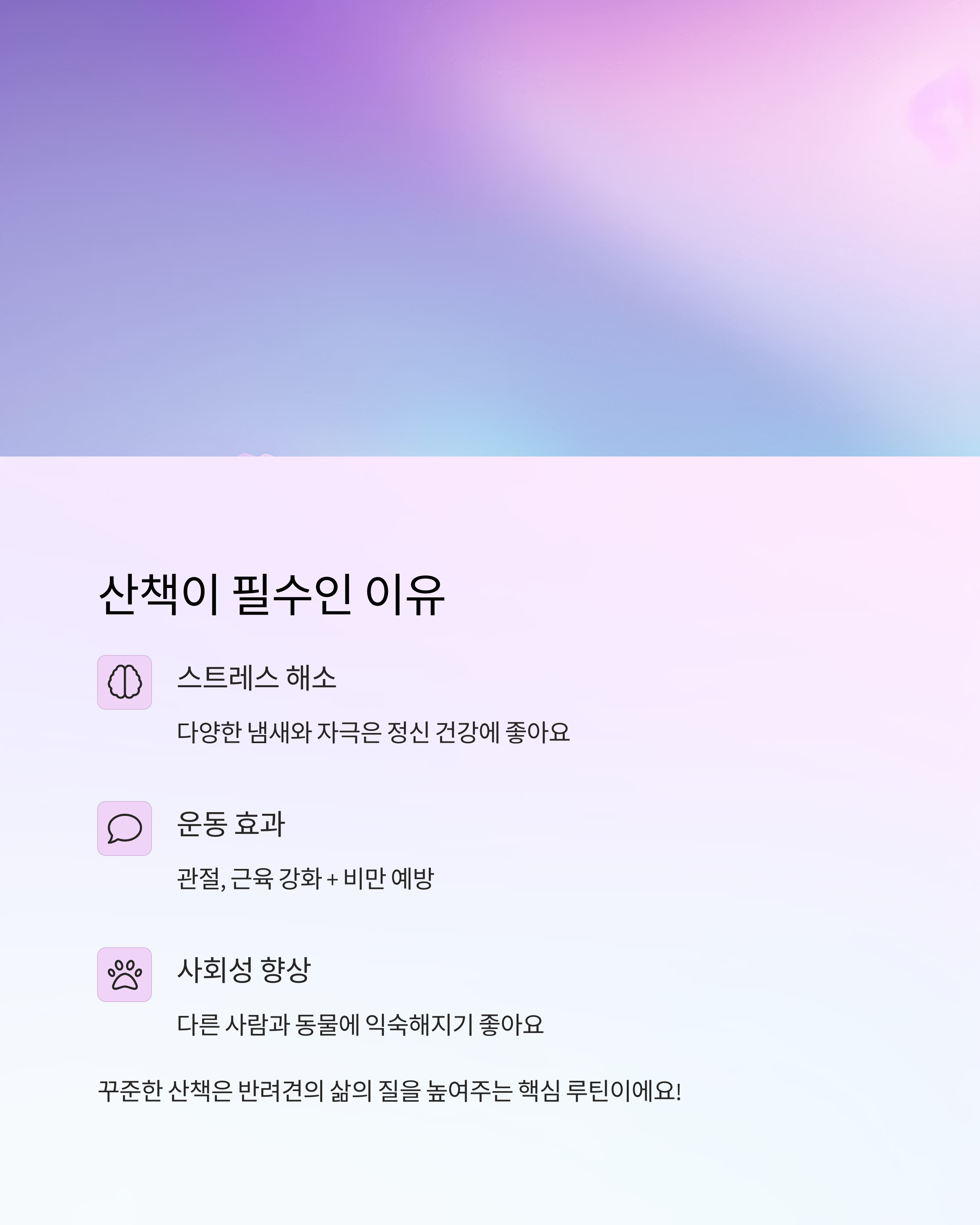 - 🚽 배변 습관 형성: 실내 배변보다 산책 중 배변을 선호해요