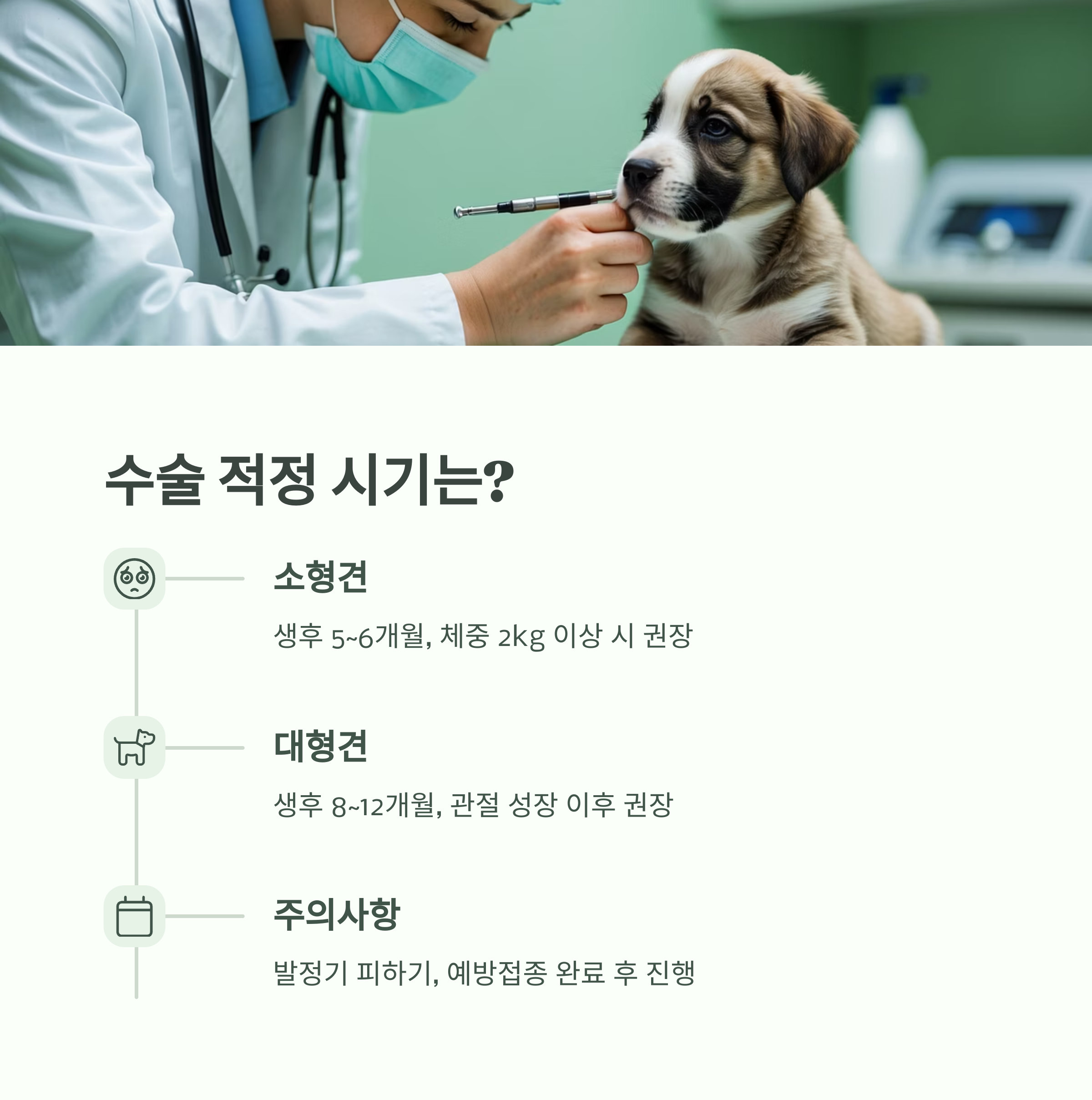 또한 예방접종이 완료된 이후에 수술을 잡는 것이 기본이에요. 수술은 전신마취가 필요하기 때문에 기초 건강 상태도 체크해야 해요. 🩺