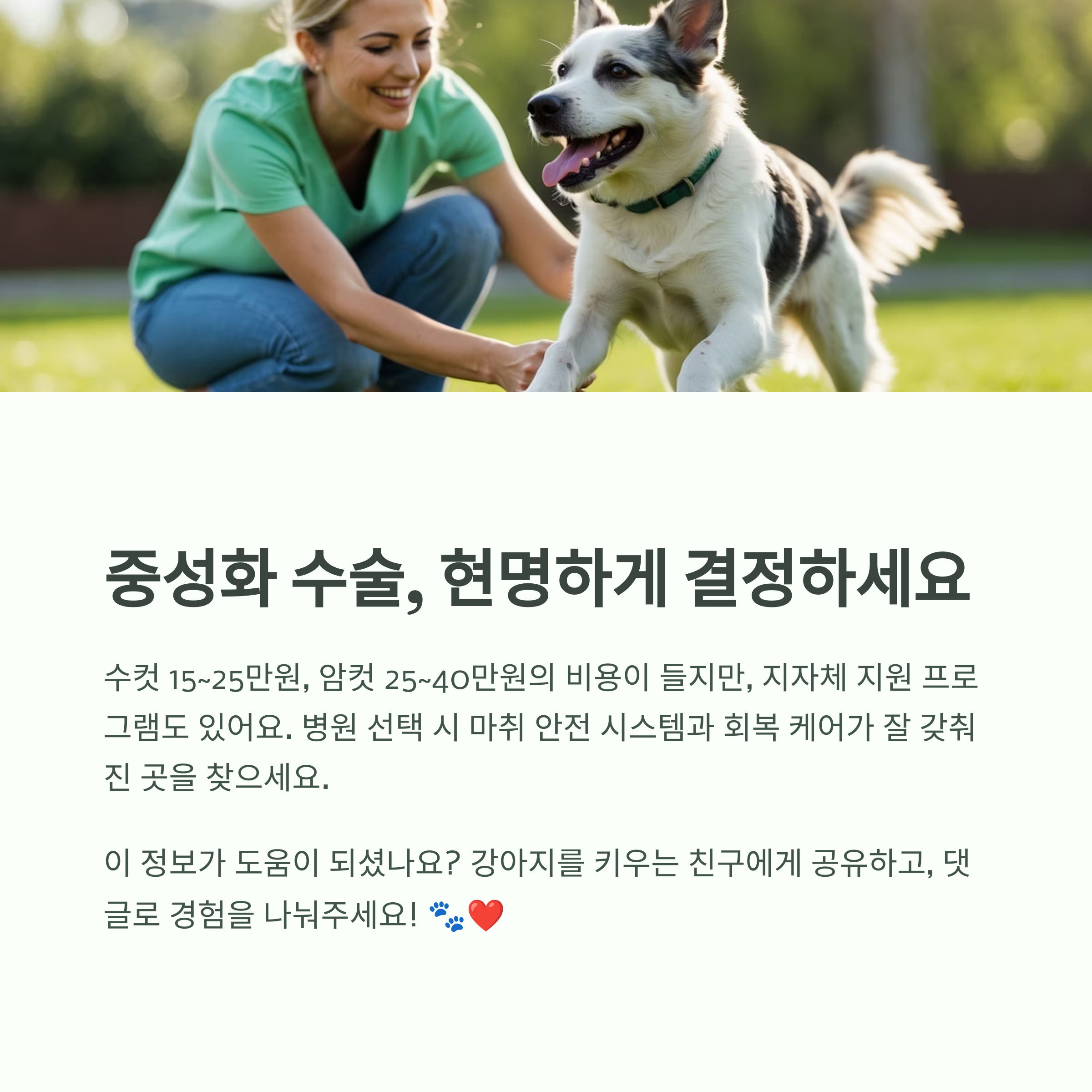 지자체에서 지원하는 저소득층 할인 프로그램이나 유기견 보호소 입양 시 무료 수술 혜택도 있으니 꼭 확인해보세요.