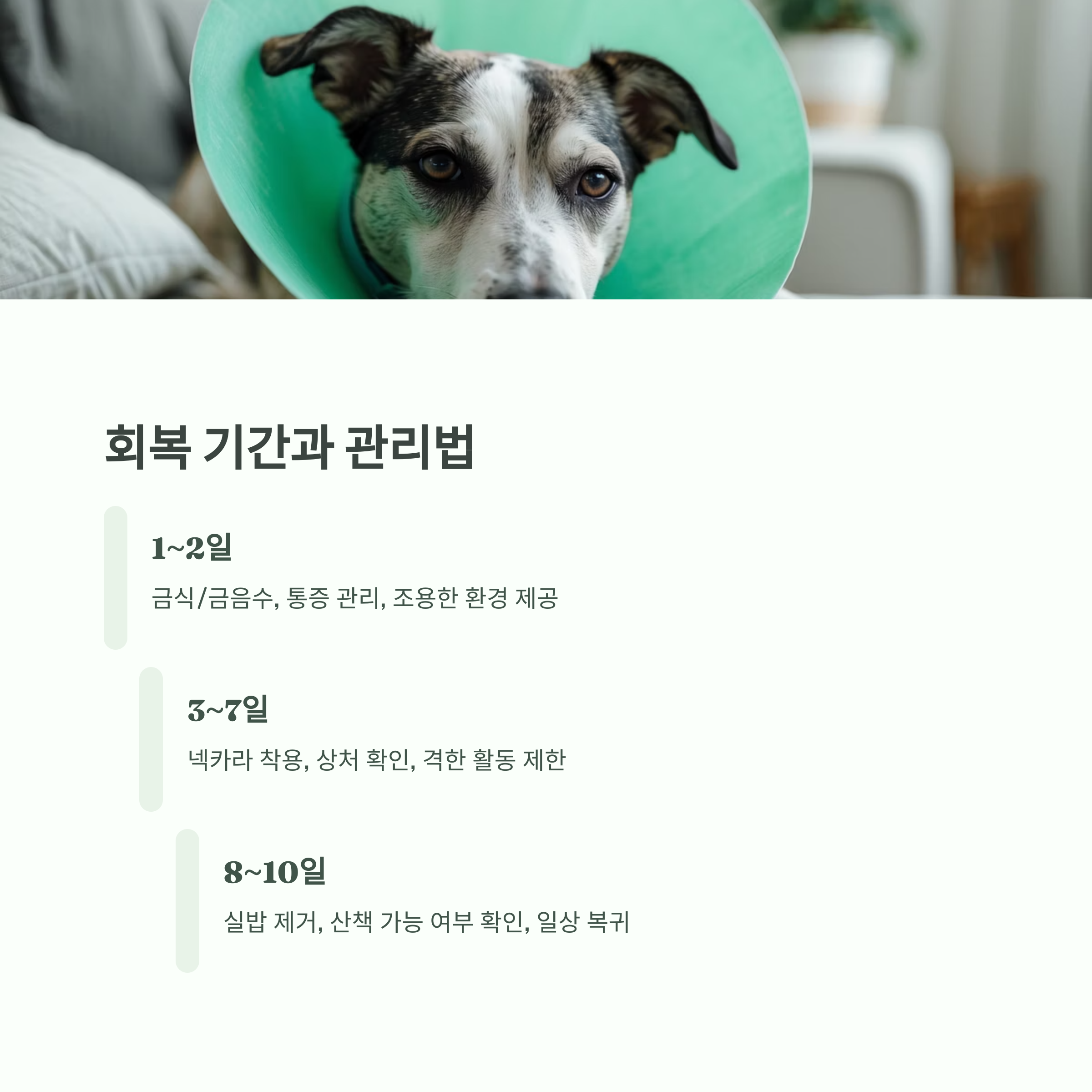 | 8~10일 | 실밥 제거 후 산책 가능 여부 확인 |
