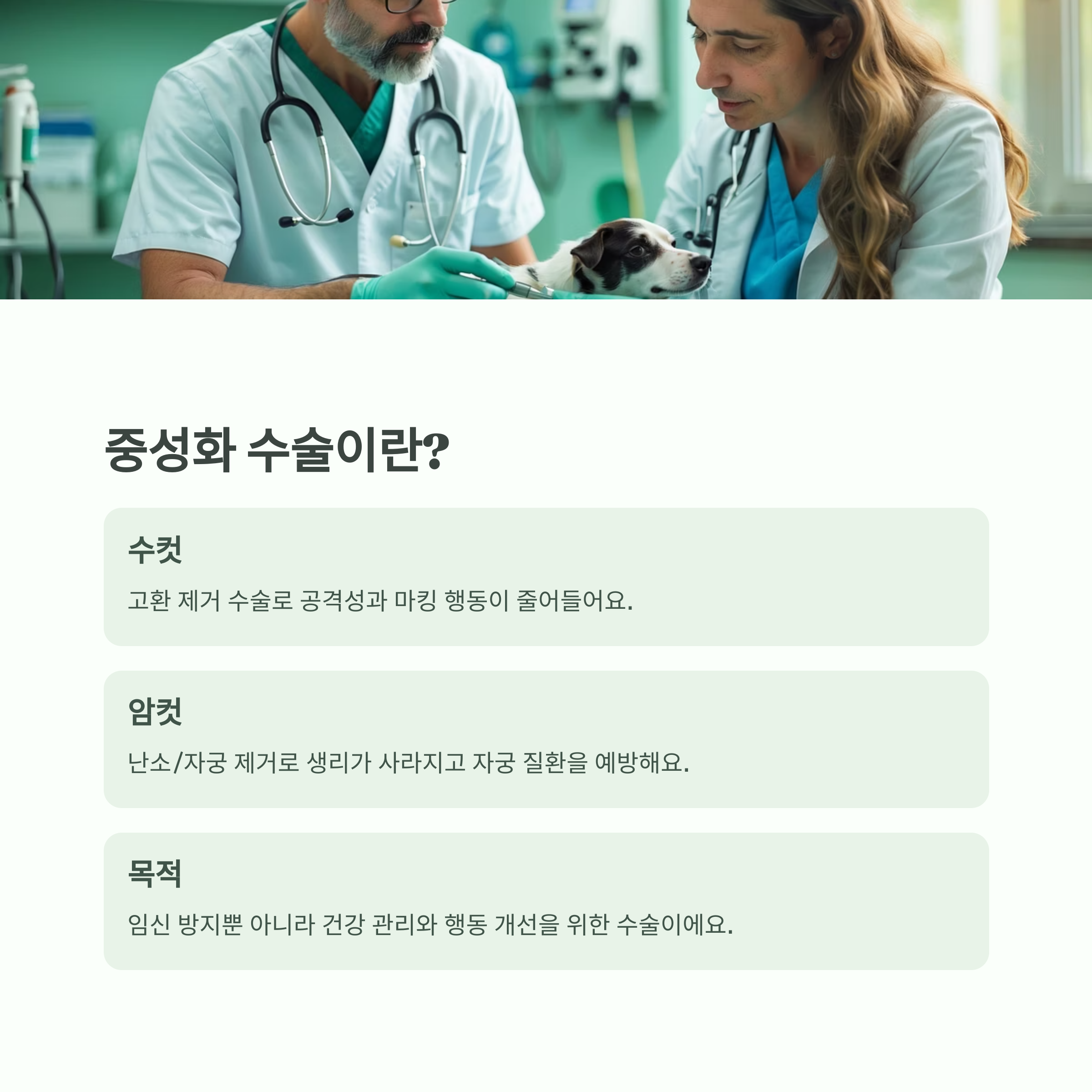 | 암컷 | 난소 또는 자궁 제거 | 생리 중단, 자궁질환 예방 |