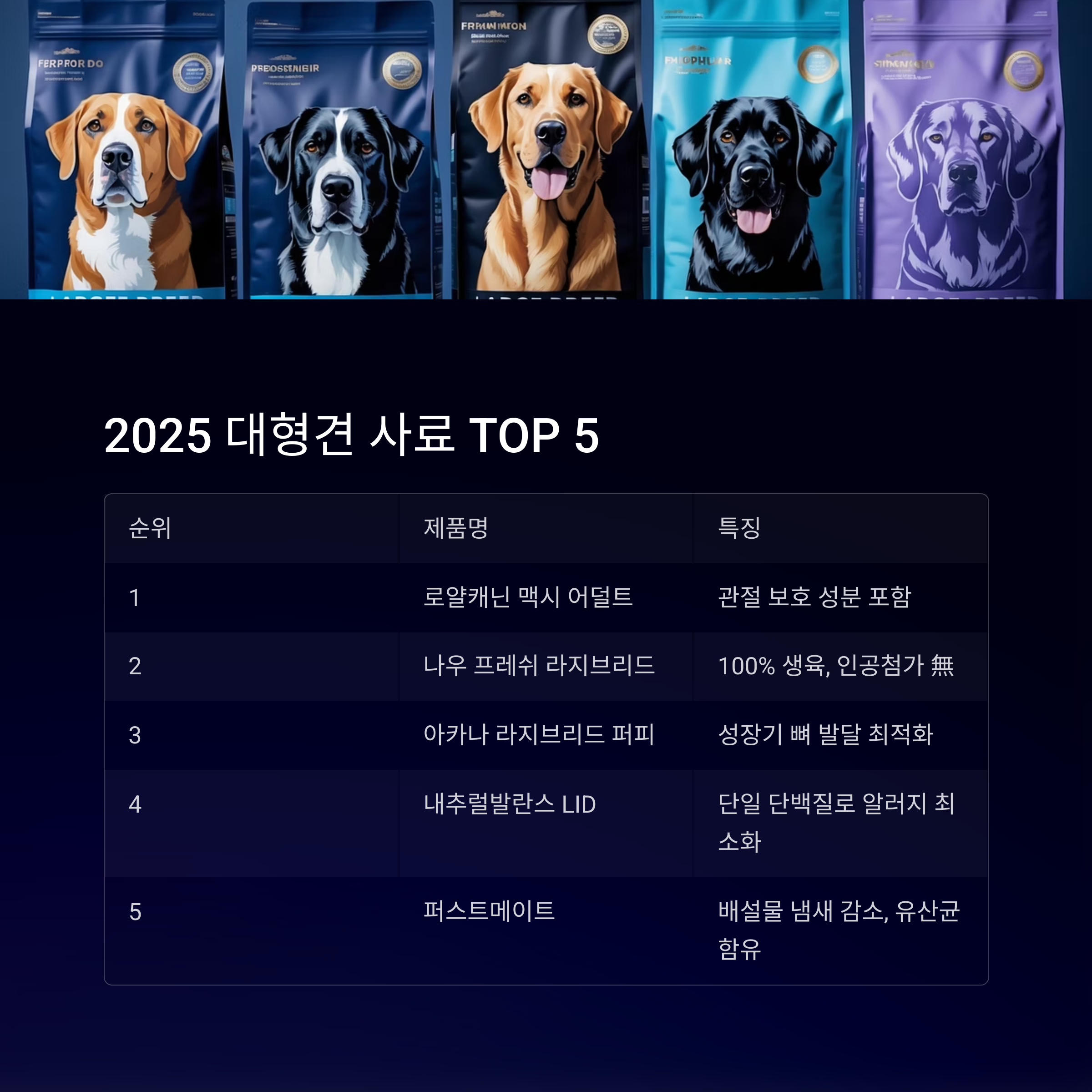 2025년 기준 보호자 만족도, 수의사 평가, 성분 안정성 등을 기준으로 선정된 대형견용 추천 사료 TOP 5예요.
