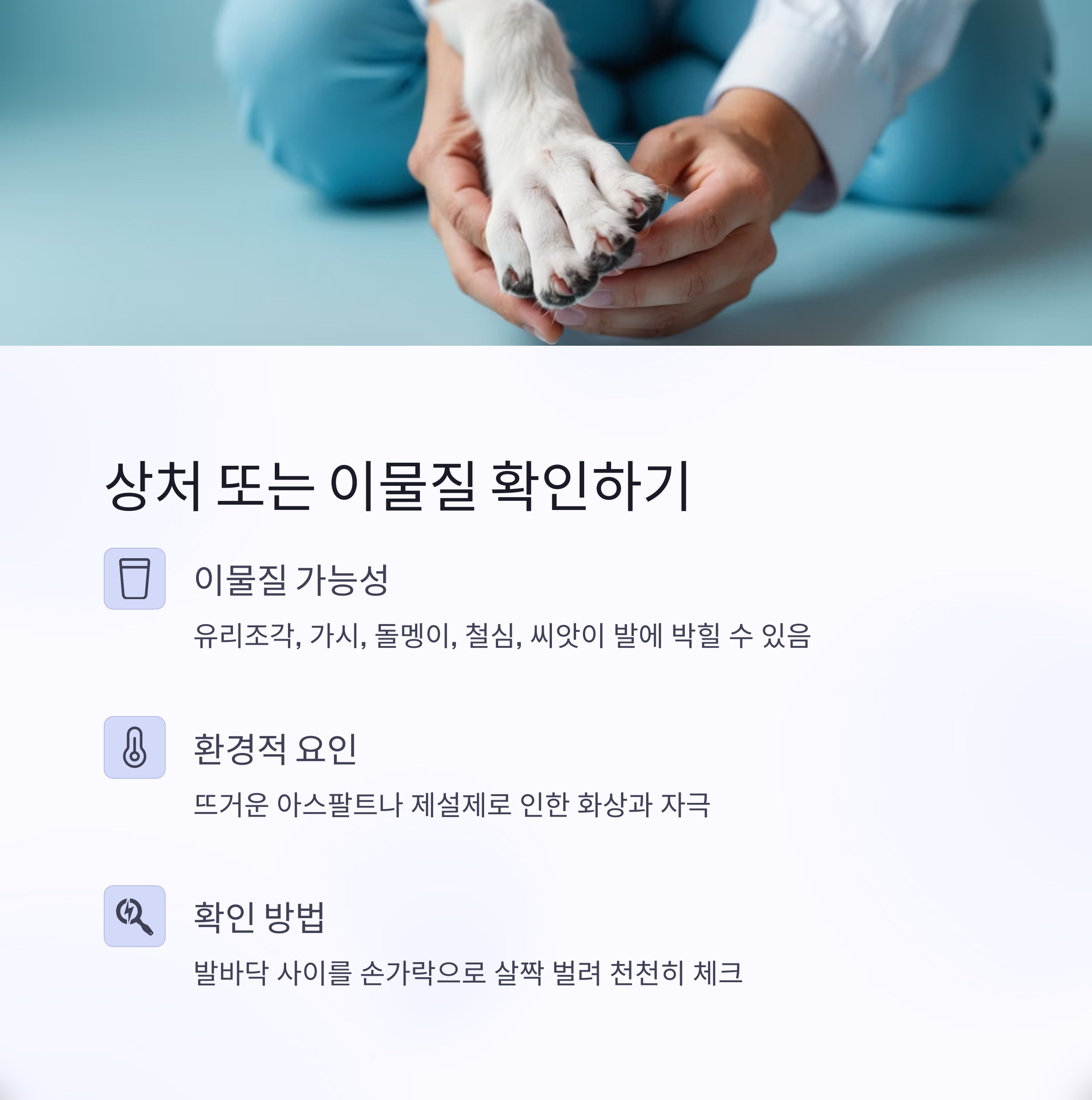 산책 후 강아지가 갑자기 발을 핥는다면, 유심히 살펴봐야 해요. 발바닥 사이에 유리조각, 가시, 작은 돌멩이, 철심, 씨앗 같은 이물질이 박혔을 가능성이 있어요.