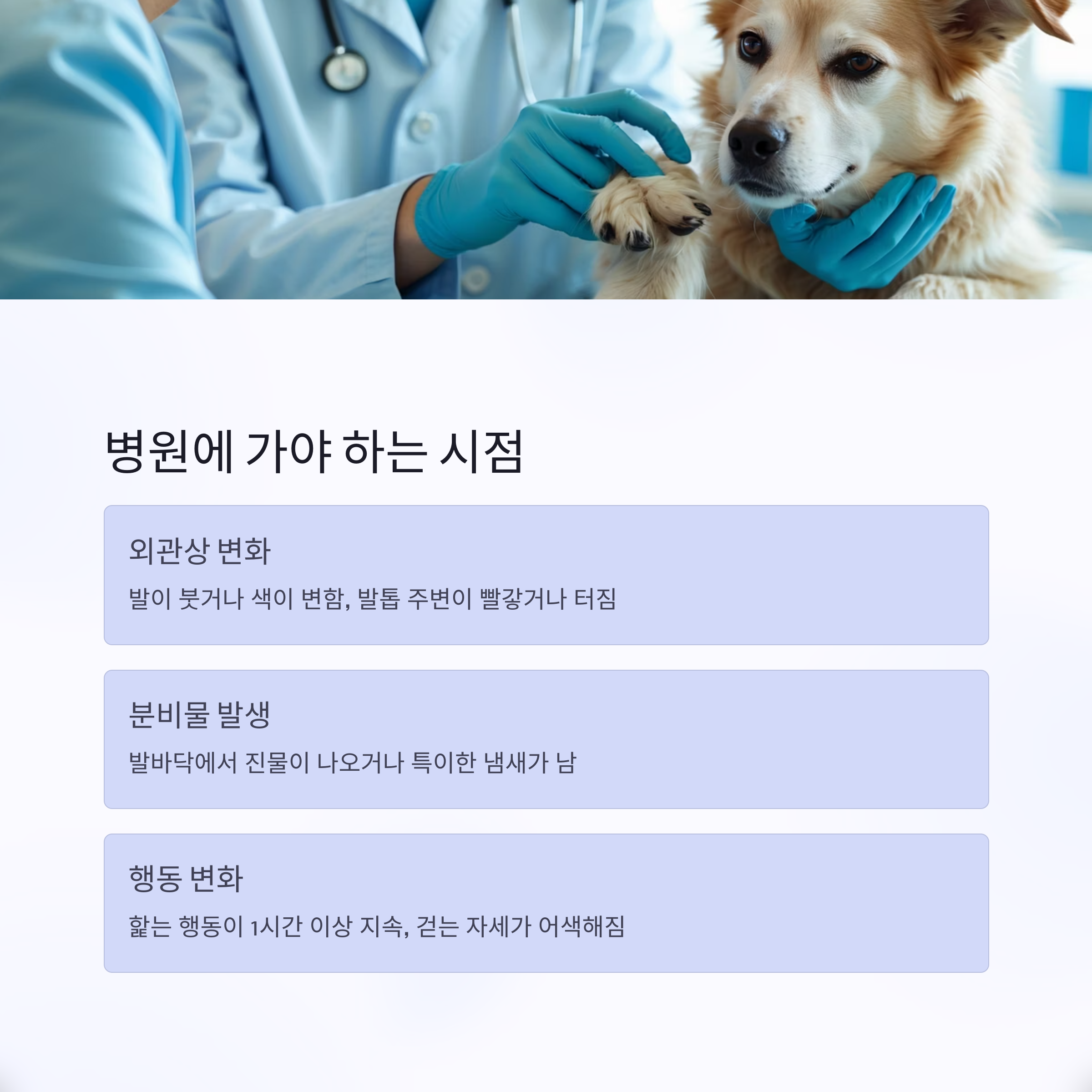 ✔ 발이 붓거나 색이 변함 ✔ 발바닥에서 진물 또는 냄새가 남 ✔ 핥는 행동이 1시간 이상 지속 ✔ 발톱 주변이 빨갛거나 터짐 ✔ 걷는 자세가 어색해짐