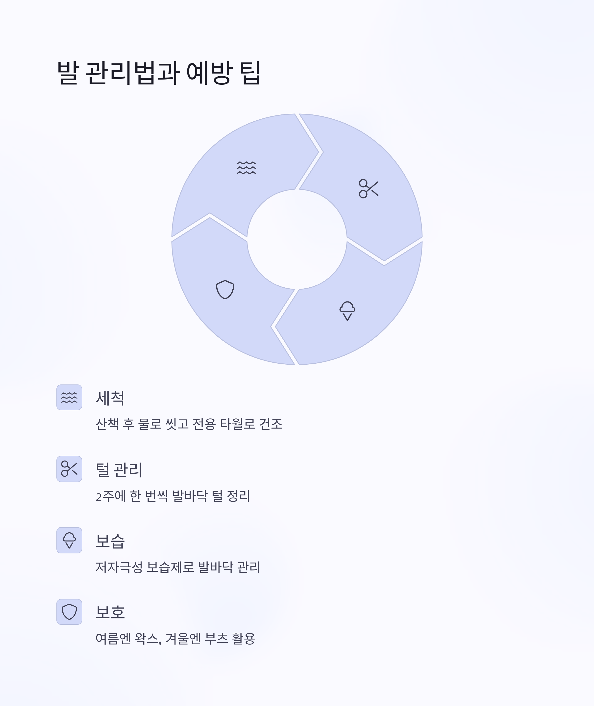 발바닥 털은 2주에 한 번씩 잘라주면 통풍이 잘 되고, 이물질이 덜 끼어요. 여름엔 발바닥 화상 방지용 왁스, 겨울엔 제설제 차단용 부츠도 도움이 돼요.