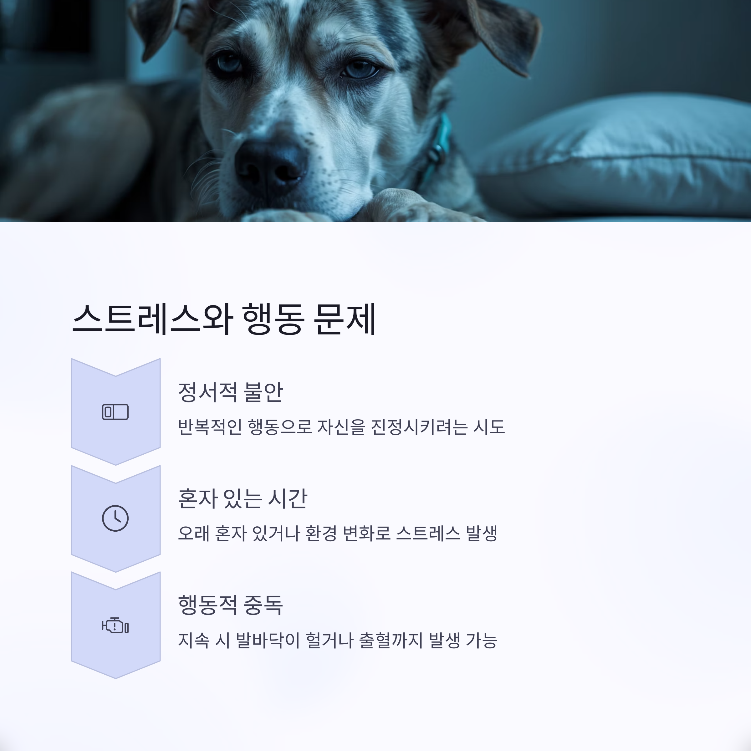 | 과도한 핥기 | 불안 자가진정 | 장난감, 산책 자극 |