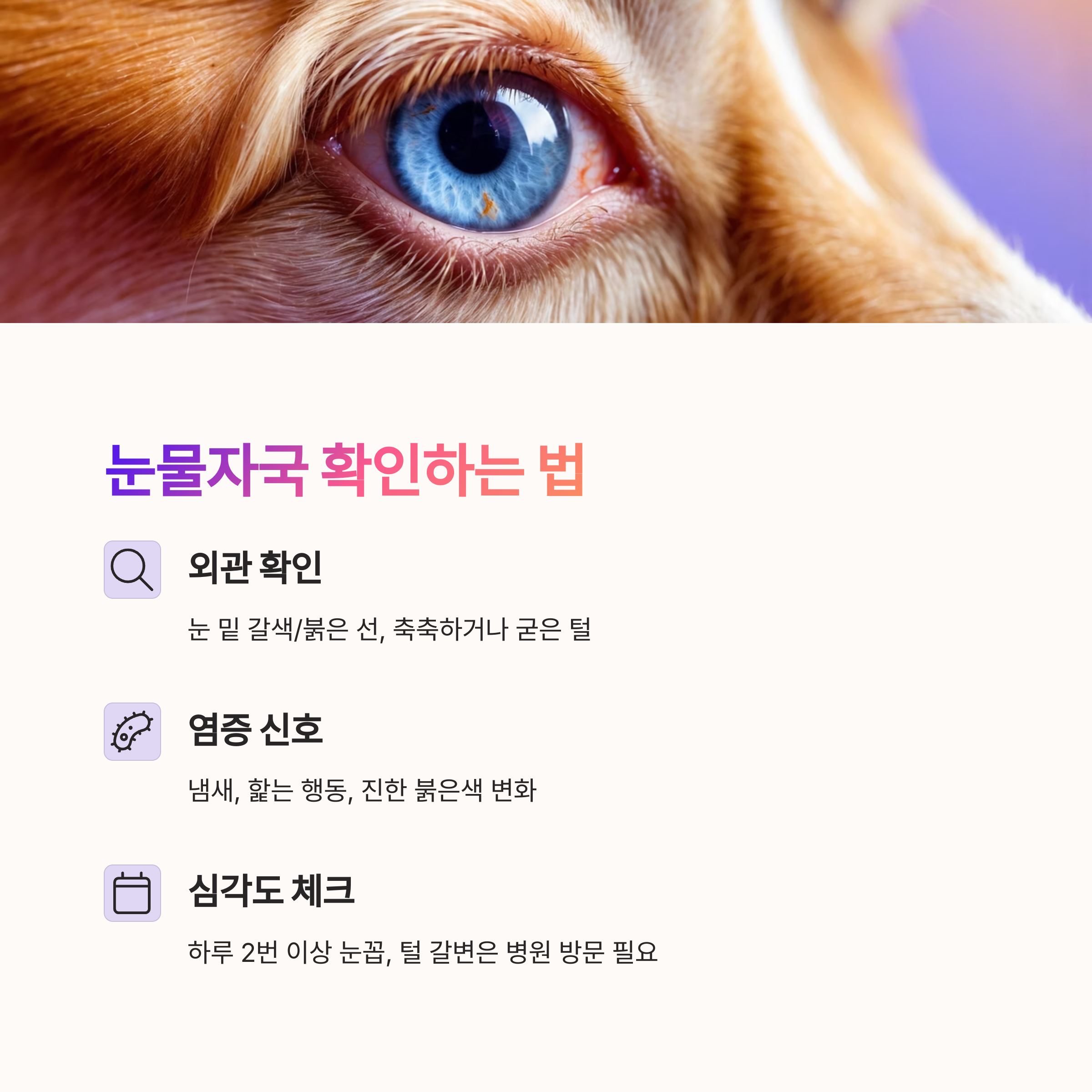 | 눈물 과다 | 알러지, 눈 감염, 털 자극 등 |