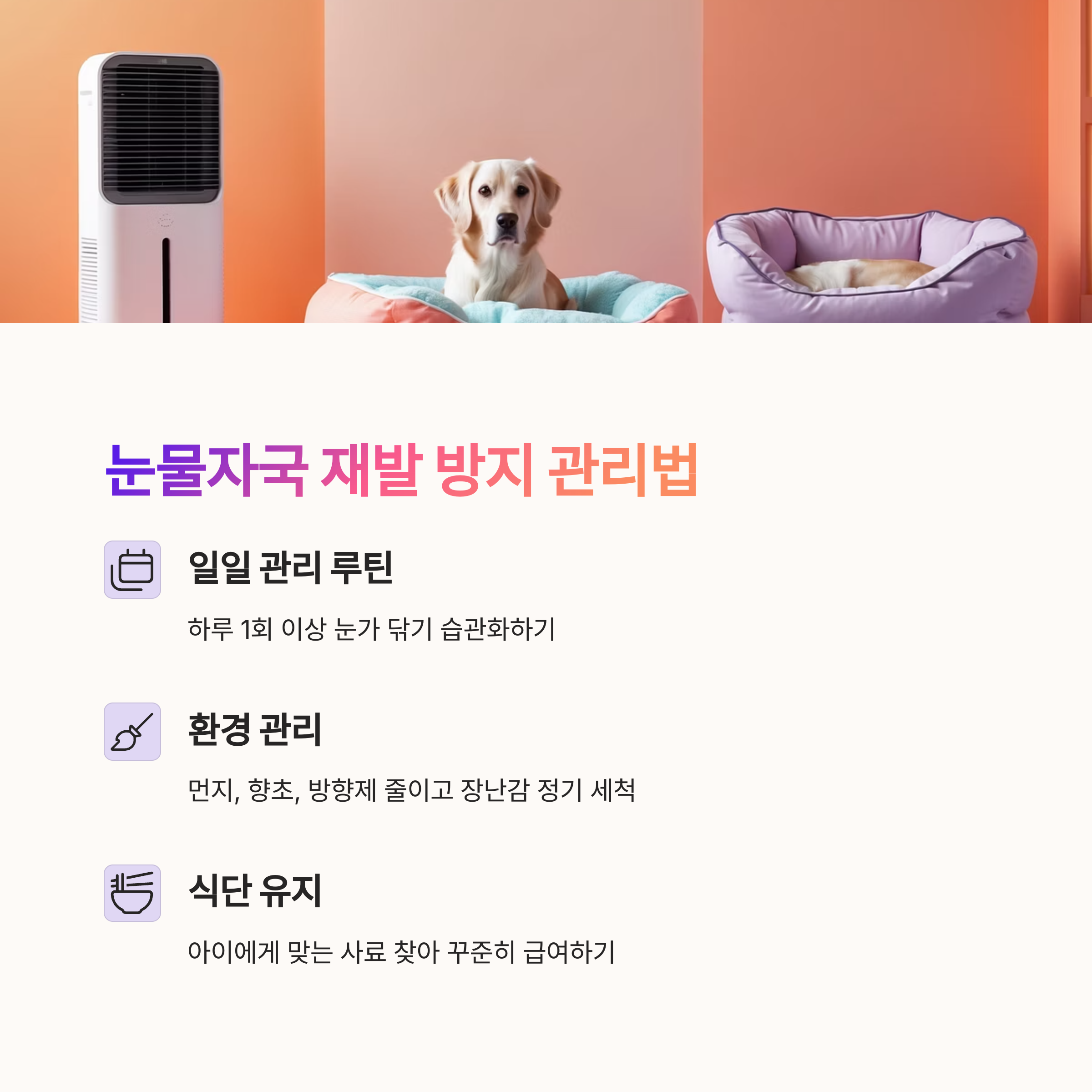 1일 1회 이상 눈가를 닦는 루틴을 만들고, 사료도 아이에게 맞는 제품으로 유지하세요. 그리고 장난감이나 베개 등 눈에 닿는 물건도 자주 세척해야 해요.