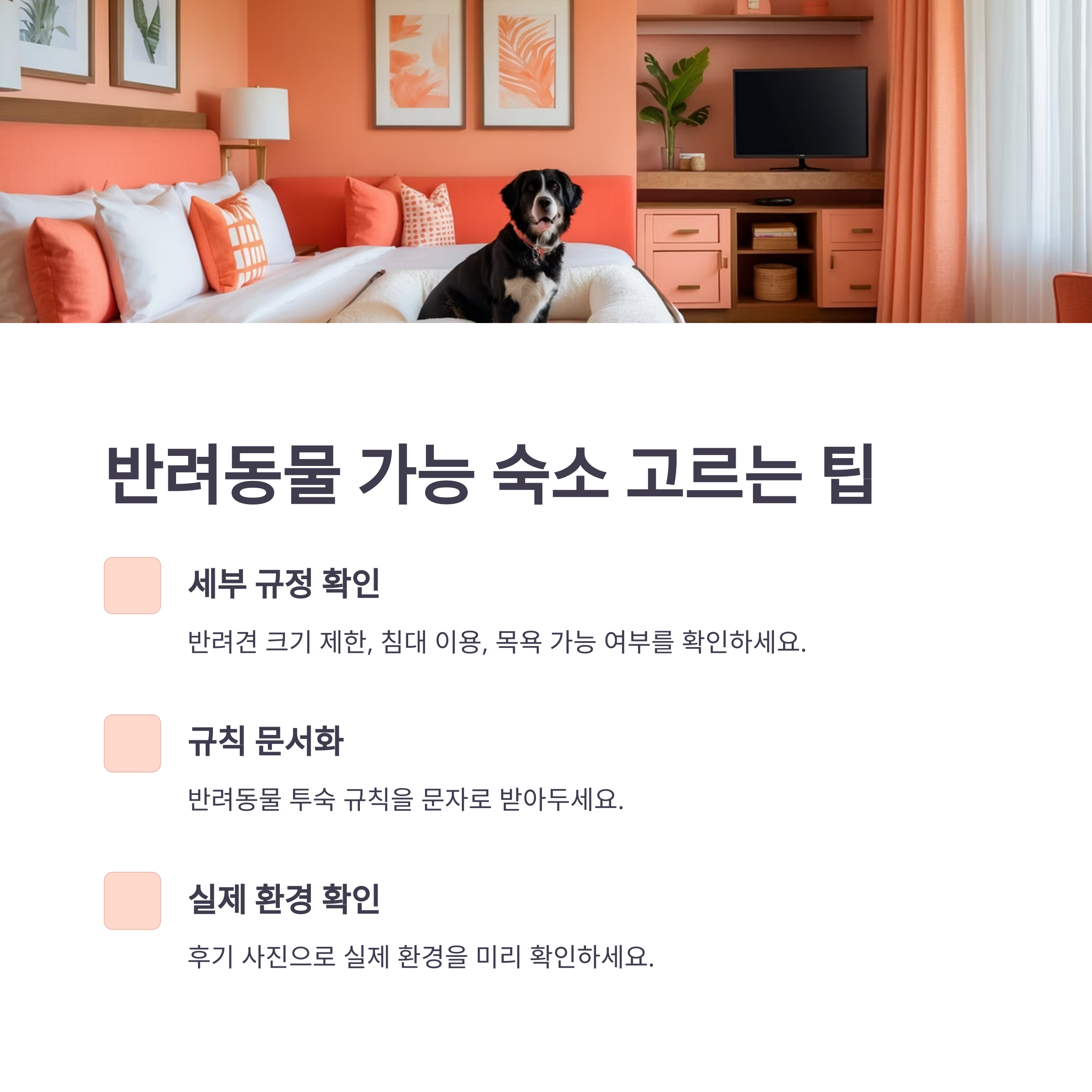 숙소 선택은 여행의 80%를 좌우해요. '펫프렌들리'라고 적혀 있어도 실제로는 제약이 많을 수 있으니 꼼꼼히 확인해야 해요.