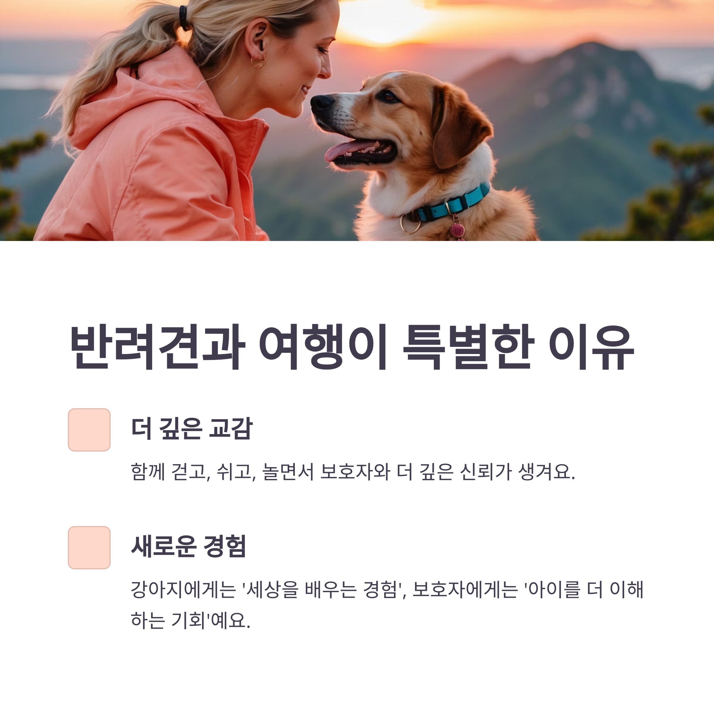 강아지와 함께하는 여행은 사람과의 여행보다 더 큰 교감과 유대감을 쌓을 수 있는 시간이 돼요. 아이에게는 새로운 환경에서의 냄새, 소리, 풍경이 모두 자극과 즐거움이에요.
