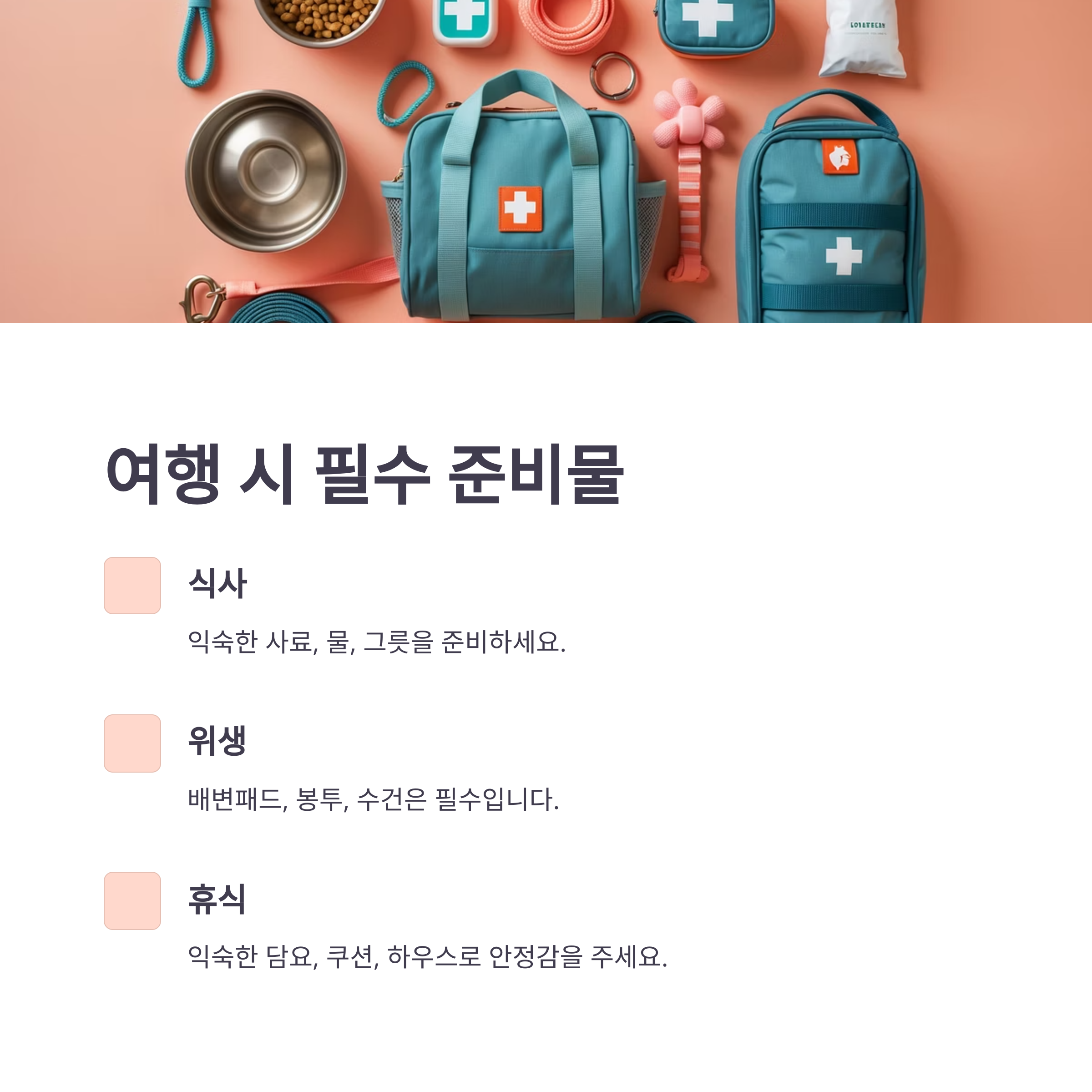 | 위생 | 배변패드, 봉투, 수건 | 차량/숙소 모두 고려 |