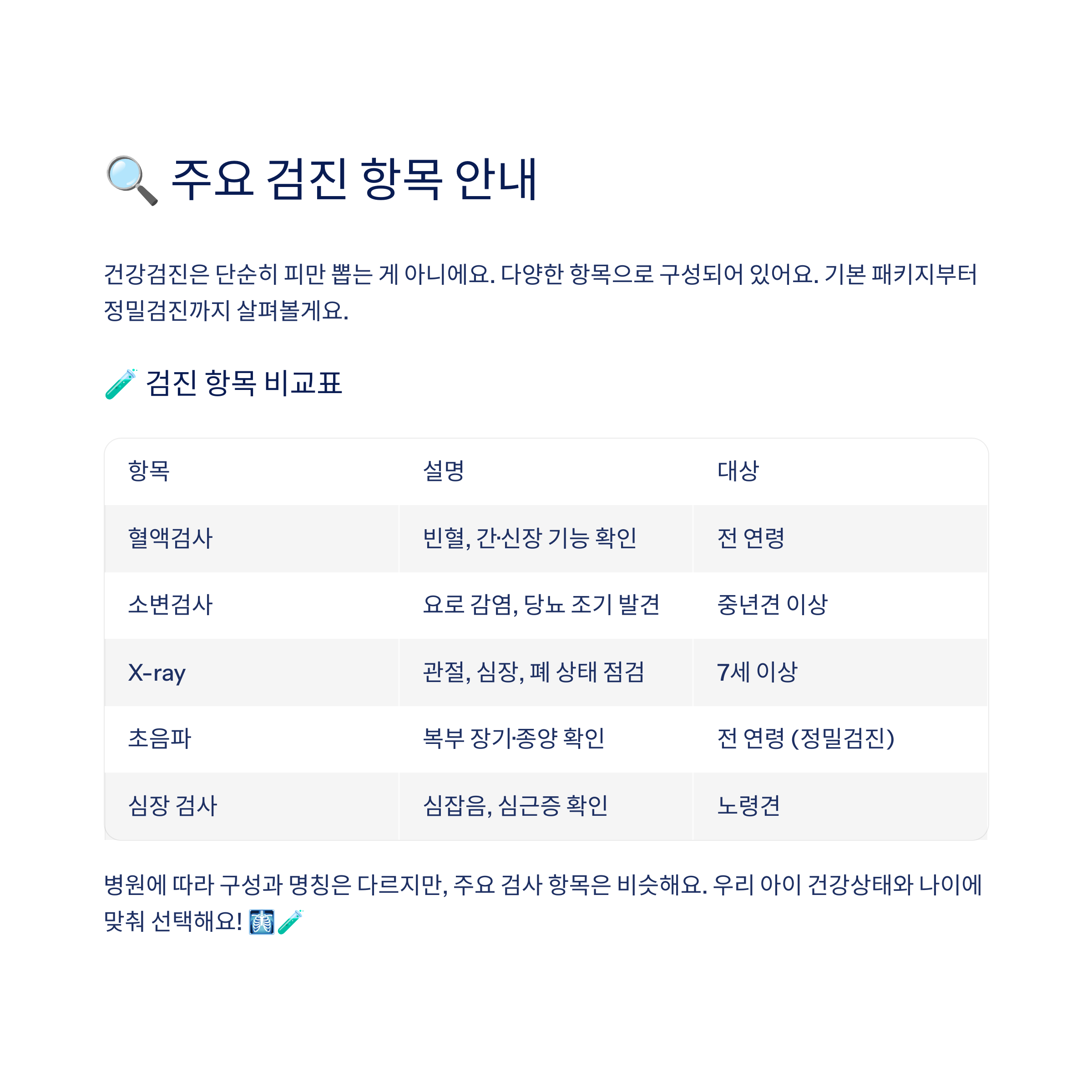 병원에 따라 구성과 명칭은 다르지만, 주요 검사 항목은 비슷해요. 우리 아이 건강상태와 나이에 맞춰 선택해요! 🩻🧪