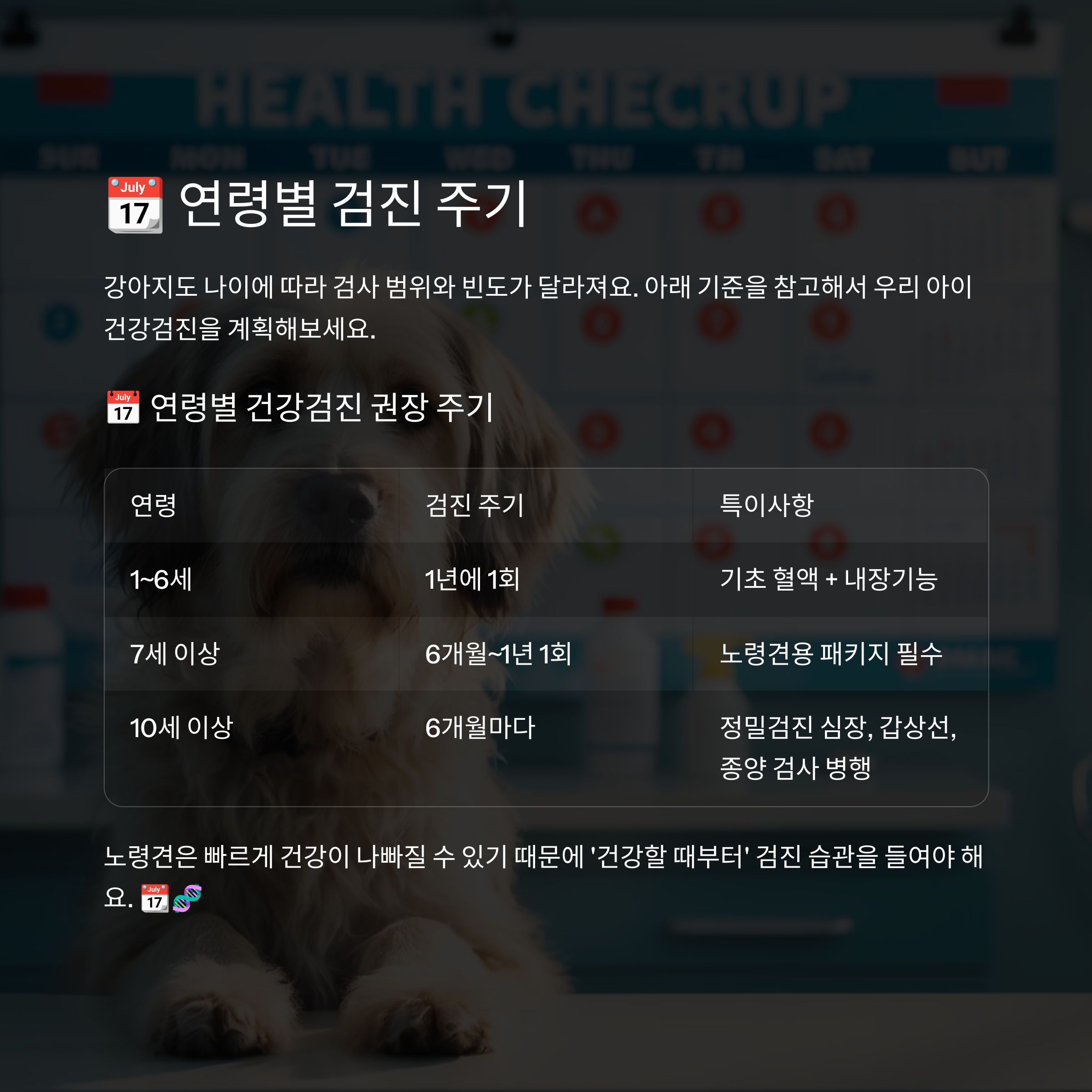 노령견은 빠르게 건강이 나빠질 수 있기 때문에 ‘건강할 때부터’ 검진 습관을 들여야 해요. 📆🧬