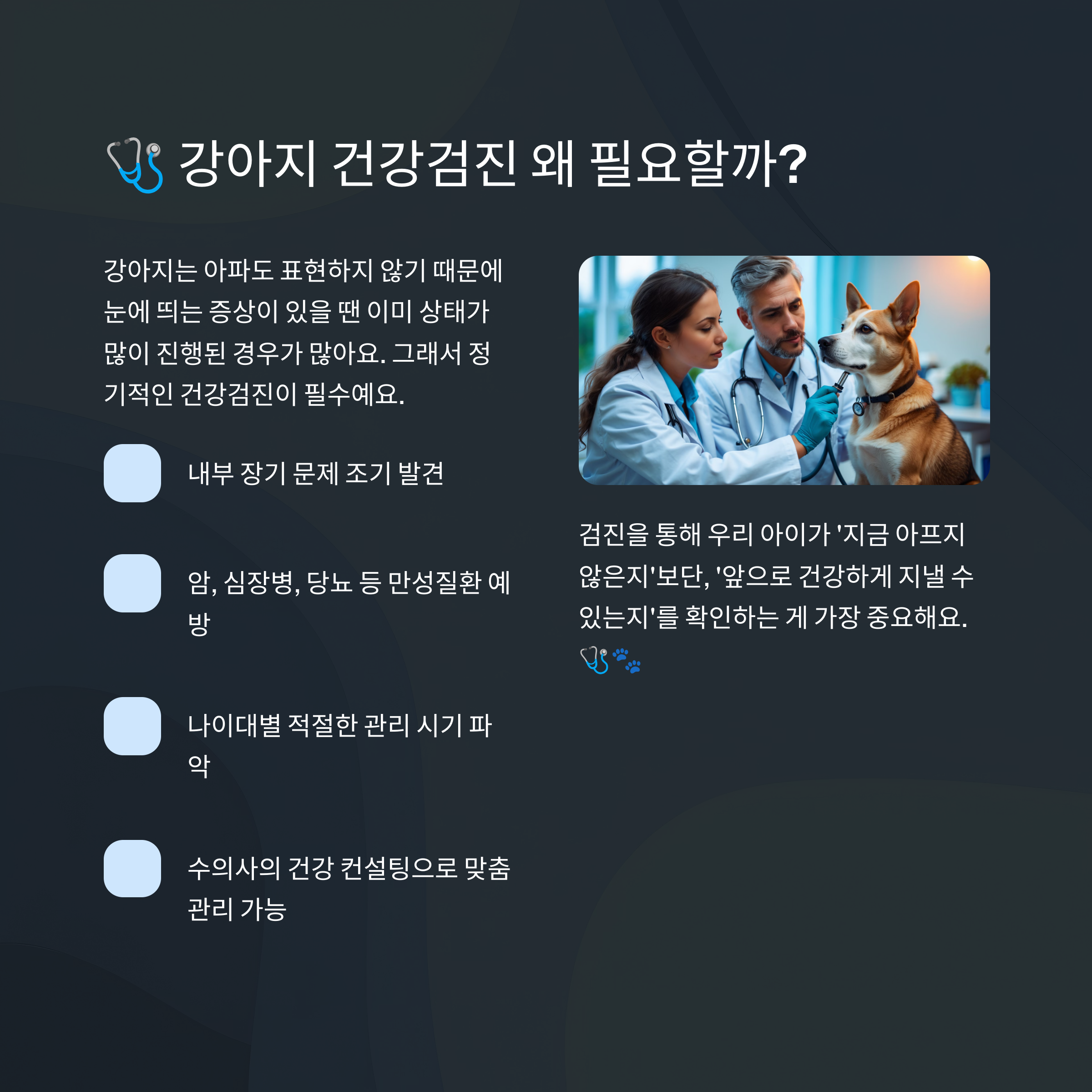 검진을 통해 우리 아이가 '지금 아프지 않은지'보단, '앞으로 건강하게 지낼 수 있는지'를 확인하는 게 가장 중요해요. 🩺🐾