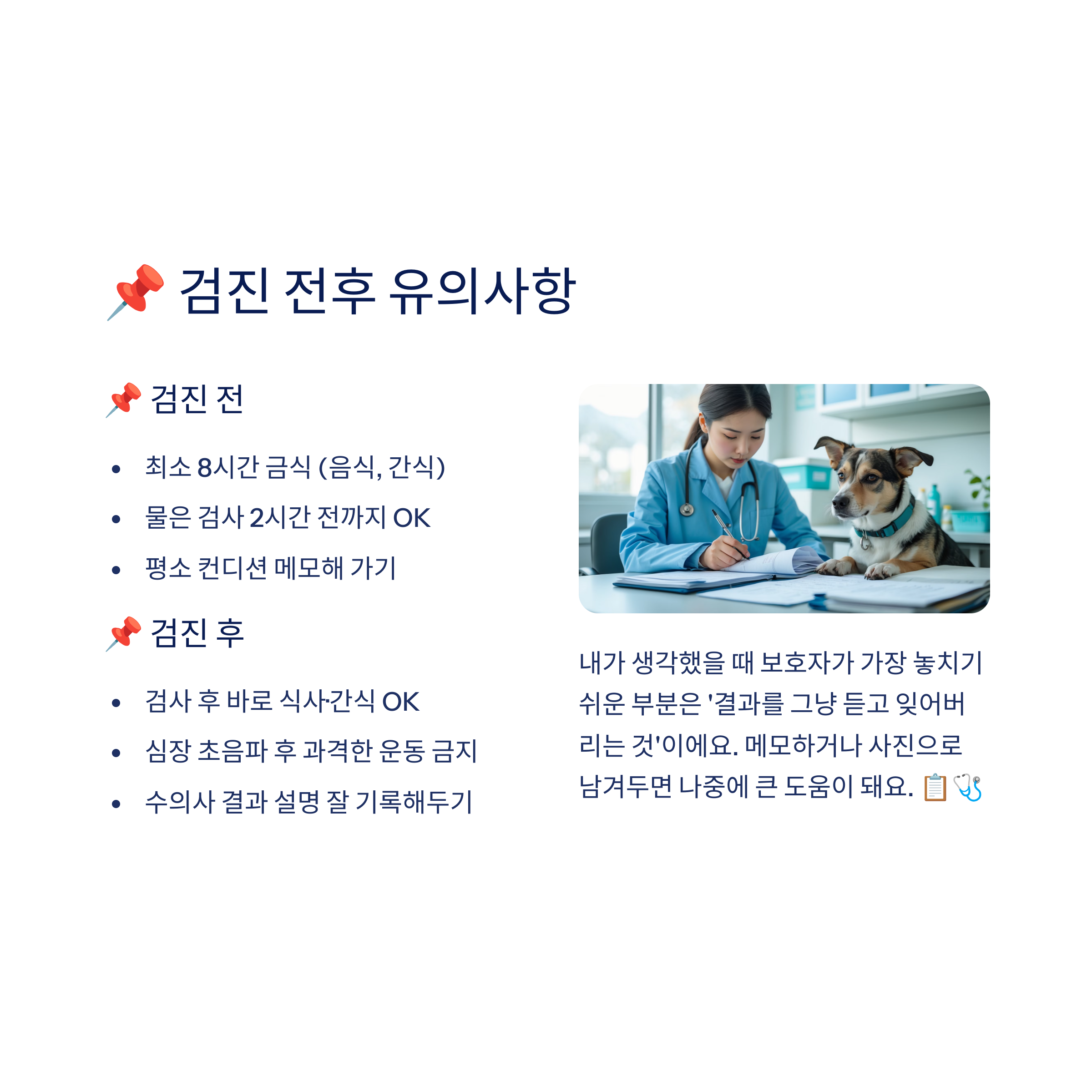 내가 생각했을 때 보호자가 가장 놓치기 쉬운 부분은 ‘결과를 그냥 듣고 잊어버리는 것’이에요. 메모하거나 사진으로 남겨두면 나중에 큰 도움이 돼요. 📋🩺