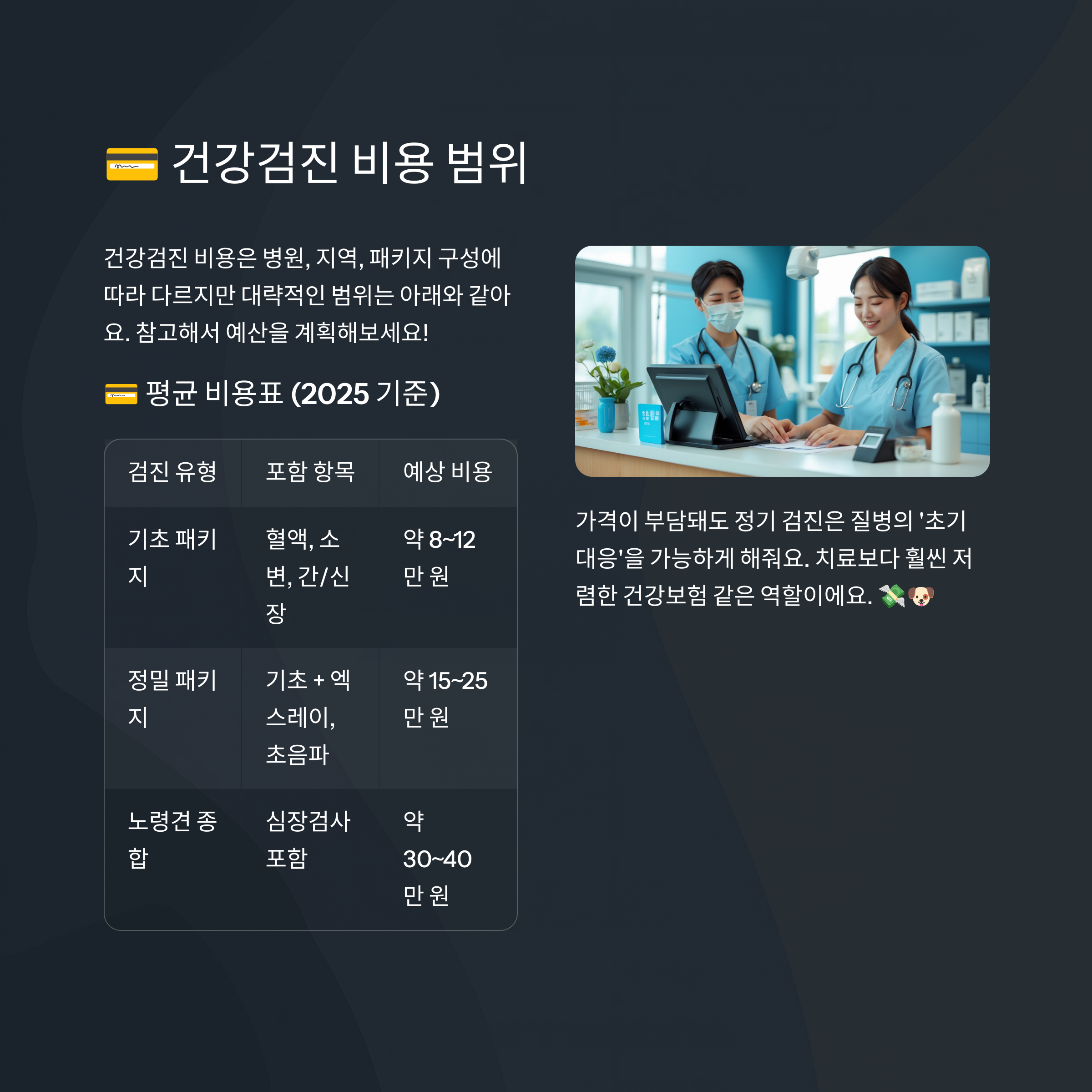 | 기초 패키지 | 혈액, 소변, 간/신장 | 약 8~12만 원 |