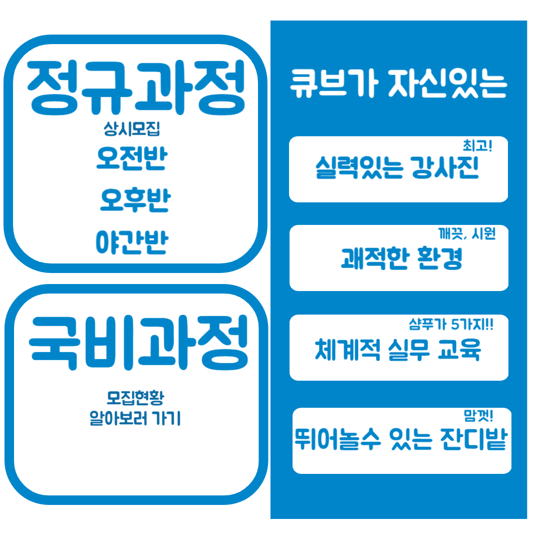 저희 학원 내일배움카드 사용 가능한 곳이에요. 정부에서 지원해주는 거라 본인 부담금만 내시면 돼요.