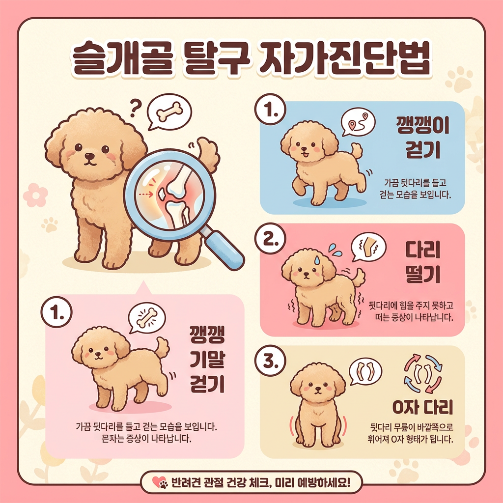 집에서 간단하게 확인할 수 있는 방법이 있어요. 강아지가 앉았다 일어설 때 뒷다리를 뒤로 쭉 차듯이 펴는 동작, 산책 중 갑자기 깽깽이를 하다가 몇 걸음 후 멀쩡해지는 모습, 뒤에서 바라봤을 때 뒷다리가 활처럼 안쪽으로 휘어있는 O자 형태가 보인다면 탈구를 강하게 의심해볼 수 있어요.
