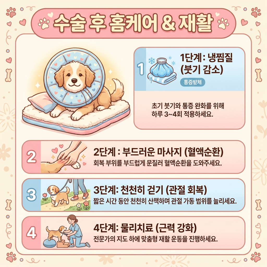 A. 일반적으로 2~3개월의 재활 기간이 필요해요. 수술 후 2주간은 절대 안정, 이후 단계적으로 걷기 운동을 늘려가며 8~12주 차에 정상적인 산책이 가능해지는 경우가 많아요.