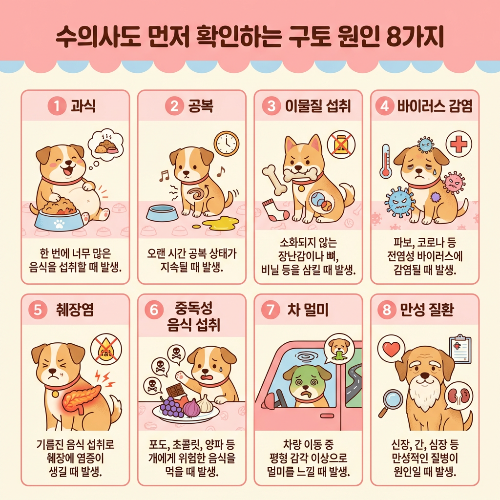 동물병원에서 "아이가 토해요"라고 하면 수의사 선생님이 가장 먼저 물어보는 질문들이 있어요. "언제부터 토했는지, 무엇을 먹었는지, 토사물 색깔은 어떤지, 횟수는 몇 번인지." 이런 정보가 원인을 빠르게 좁히는 핵심 단서가 되기 때문이에요. 아래 8가지 원인은 실제 임상에서 가장 자주 진단되는 순서대로 정리했어요.
