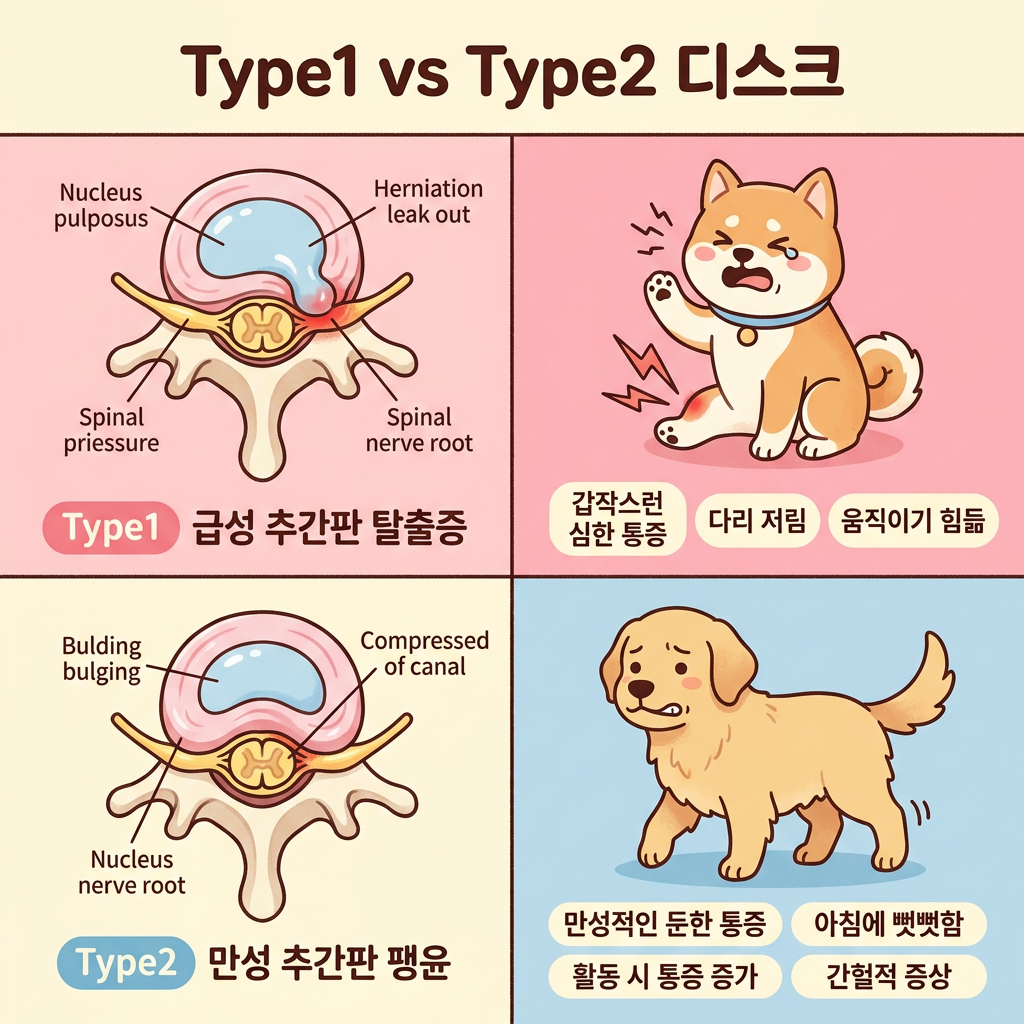 강아지 디스크는 크게 두 가지 유형으로 나뉘고, 이 유형에 따라 발생 시기, 취약 품종, 치료 접근 방식이 완전히 달라져요. 수의사 선생님께 진단받을 때 어떤 유형인지 반드시 확인하셔야 해요.