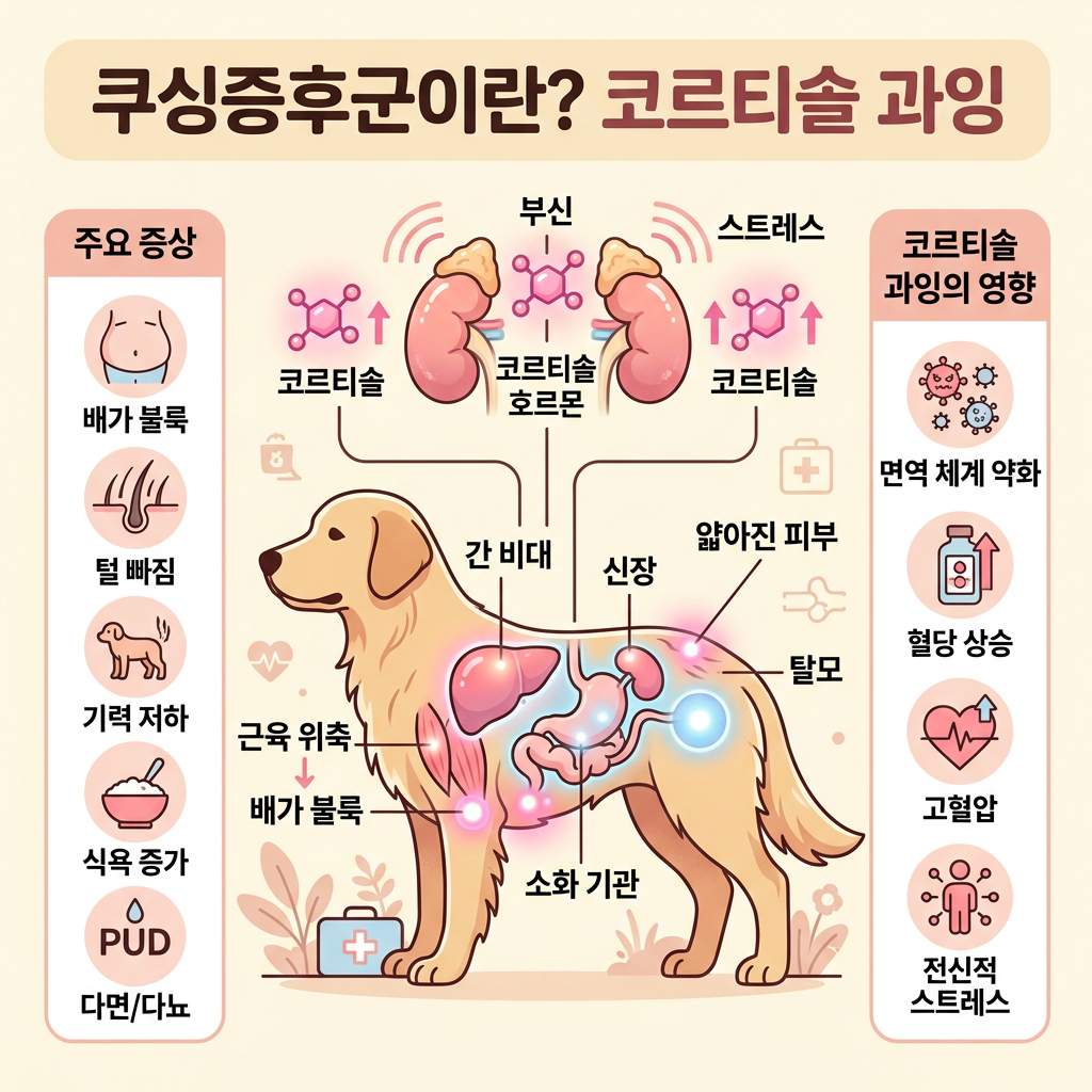 강아지 쿠싱증후군의 정식 명칭은 부신피질기능항진증(Hyperadrenocorticism)이에요. 이름이 길고 어렵지만, 핵심은 하나예요. 바로 신장 위에 붙어있는 '부신'이라는 기관에서 스트레스 호르몬인 코르티솔(Cortisol)이 필요 이상으로 과다 분비되는 상태를 말하는 거거든요.