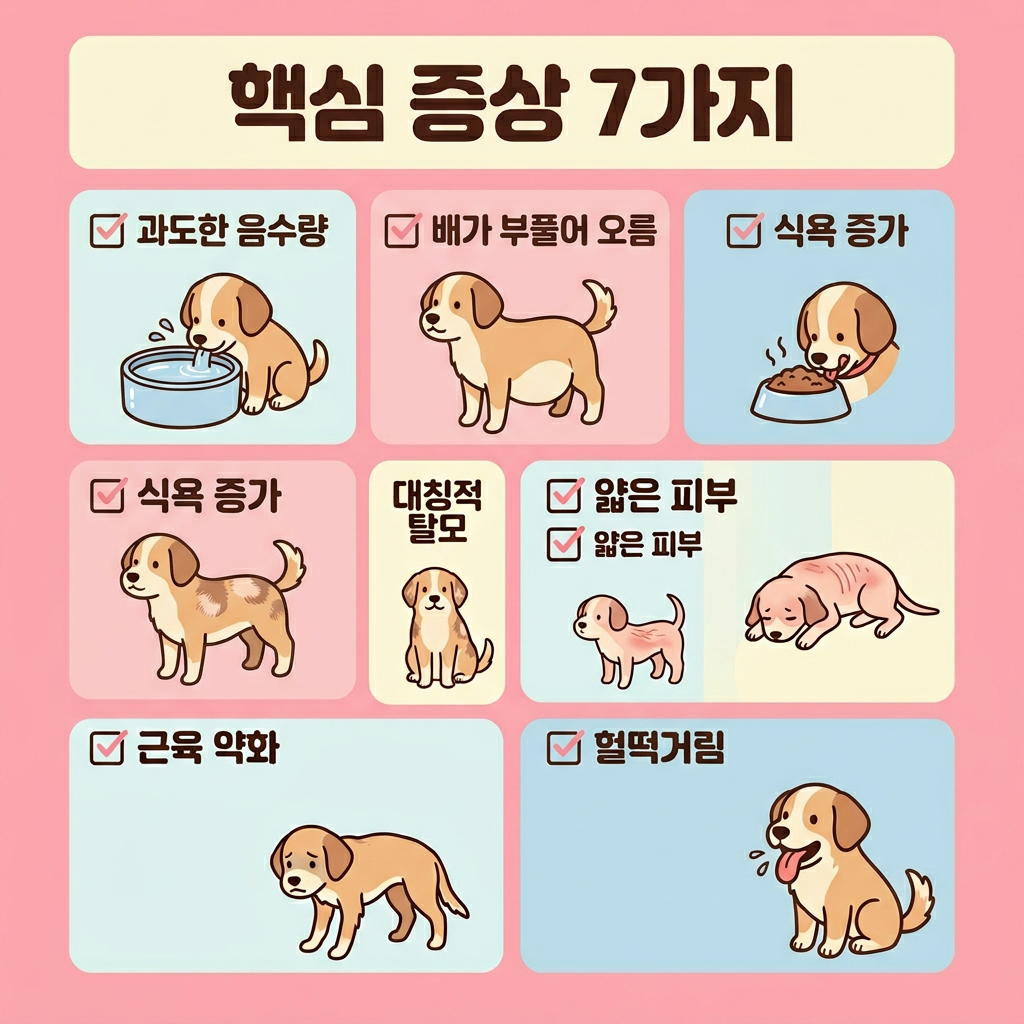 물 많이 마심 + 배 빵빵 + 식탐 폭증이 세 가지가 동시에 나타난다면, 이건 거의 쿠싱증후군 교과서 증상이에요. 나이가 7살 이상이라면 더욱 빠르게 동물병원 검사를 받아보시는 걸 강력히 권장해요.