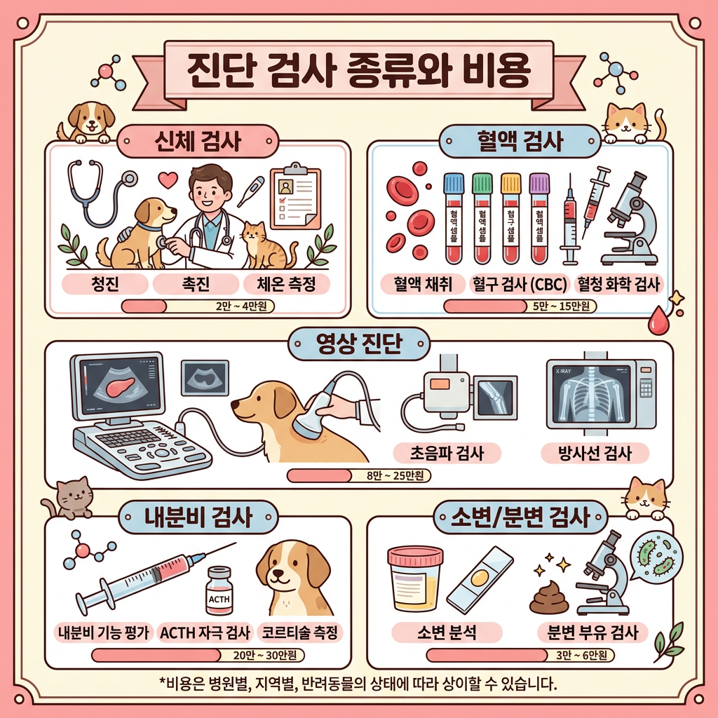 기본 혈액·소변검사는 3~8만원 내외, 복부 초음파는 5~15만원 내외, ACTH 자극 시험은 10~20만원 내외, LDDST는 15~25만원 내외로 알려져 있어요. 여러 검사를 동시에 진행하면 패키지로 할인되는 경우도 있으니 상담 시 문의해보세요. 정확한 비용은 병원과 지역마다 차이가 있으니 반드시 사전 확인이 필요해요.