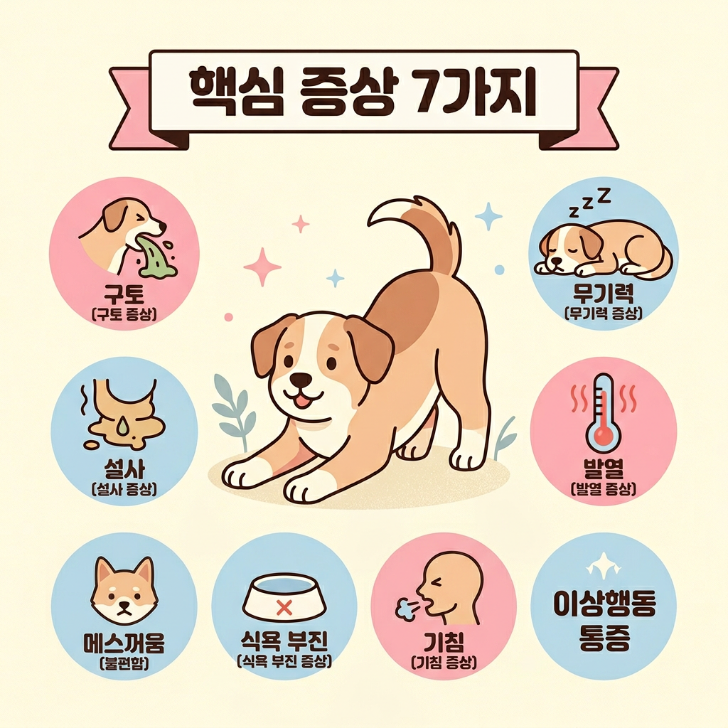 구토가 5회 이상 반복되거나 / 혈변 또는 혈토가 보이거나 / 강아지가 완전히 쓰러져 일어나지 못하거나 / 호흡이 빠르고 잇몸이 창백하거나 푸른빛을 띠고 있다면, 지금 당장 24시 응급 동물병원으로 이동하셔야 해요. 이런 증상은 쇼크 또는 패혈증으로 진행 중이라는 신호일 수 있어요.