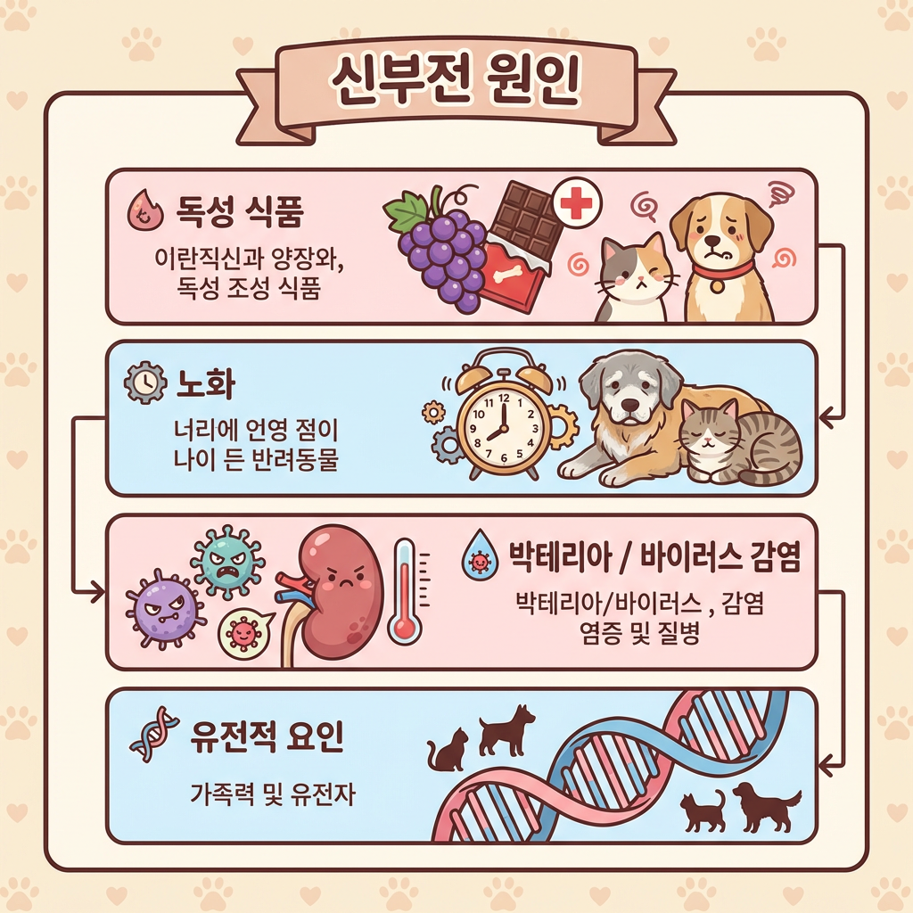 강아지 신부전의 원인은 크게 외부 요인과 내부 요인으로 나눌 수 있어요. 보호자가 미리 알고 예방할 수 있는 것들이 생각보다 많기 때문에 꼭 숙지해두세요.