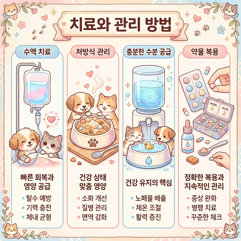 신부전의 가장 기본적인 치료는 수액 요법이에요. 신장이 수분 조절 능력을 잃어서 생기는 탈수를 보충하고, 혈중 노폐물 농도를 낮추는 역할을 해요. 경증의 경우 통원 수액 치료를 진행하고, 심한 경우 입원 치료가 필요해요.